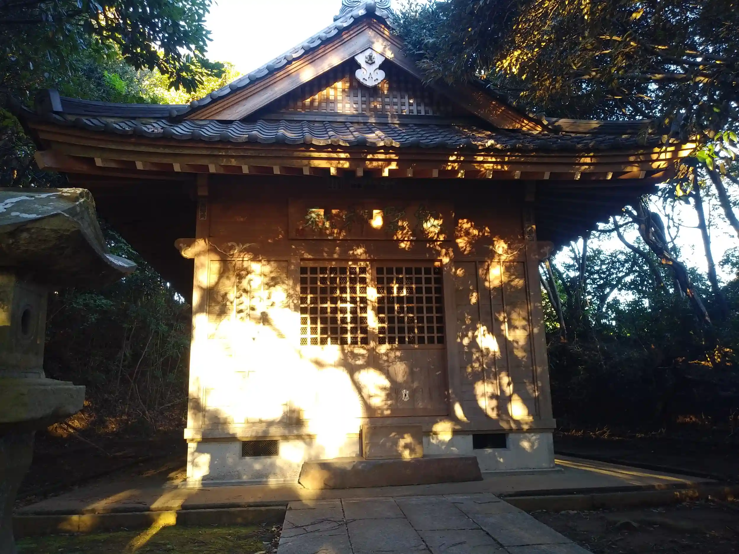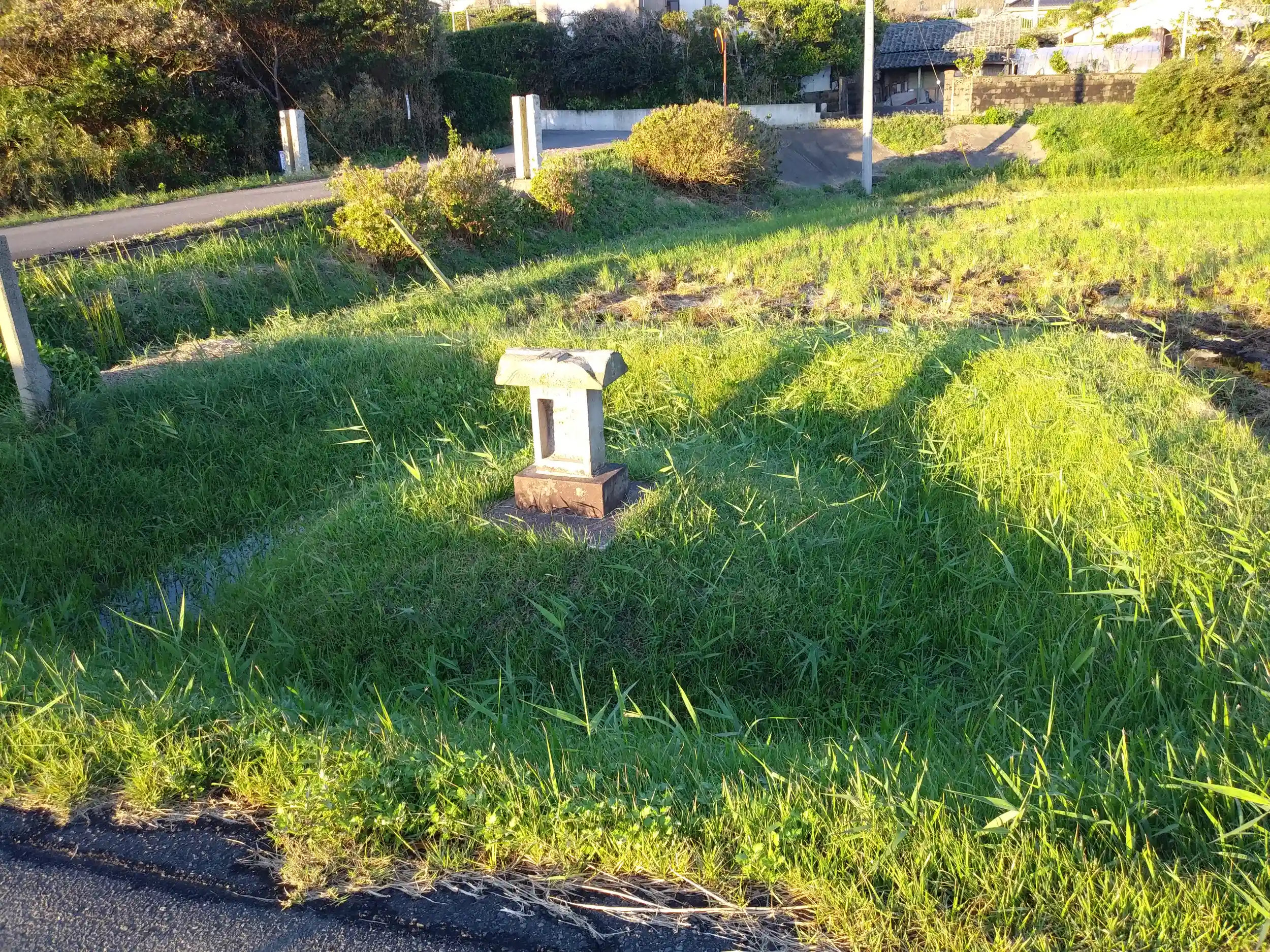 仕方ないので、しぶしぶ進路を内陸に向けて進んでいくと、道端に小さな祠がありました。周囲を堀が囲んでます。厳島神社みたいな造りです。