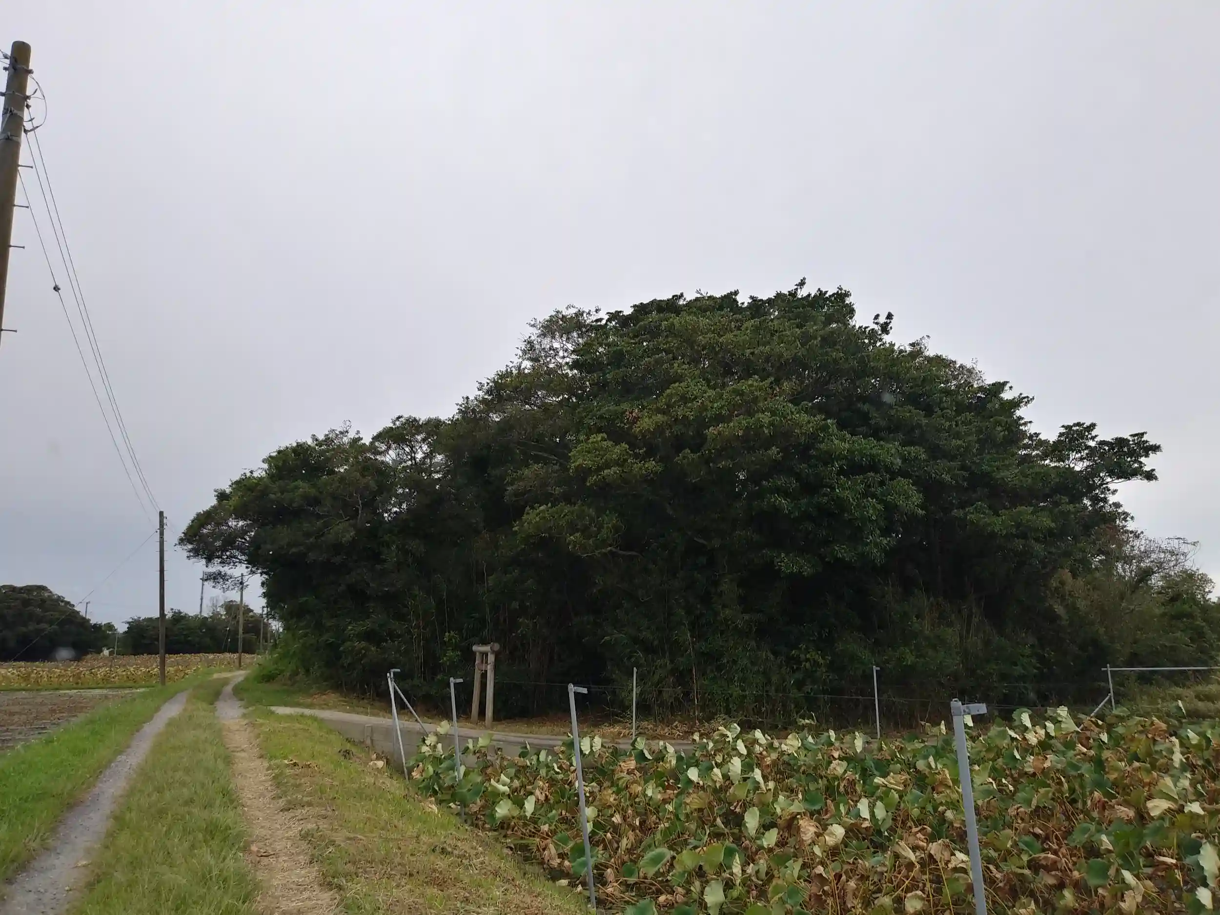 田んぼのなかに、いかにも神社がありそうな木森があります。近づいてみると、案の定、鳥居がありました。