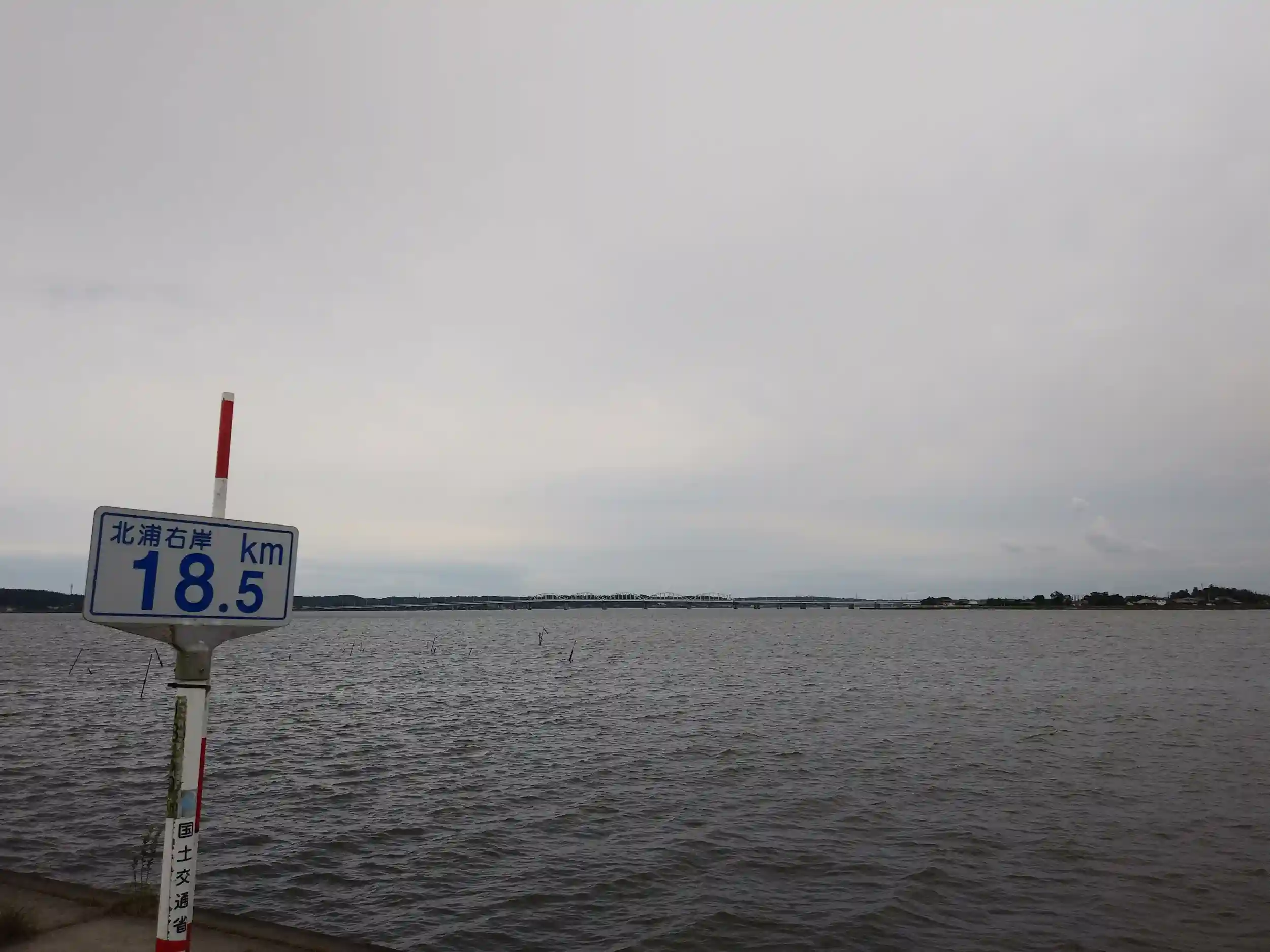 北浦の右岸18.5kmの看板がでてます。神宮橋からの距離です。ちなみになぜ北浦というと、鹿島神宮から見て北側にある浦(海)という意味みたいです。