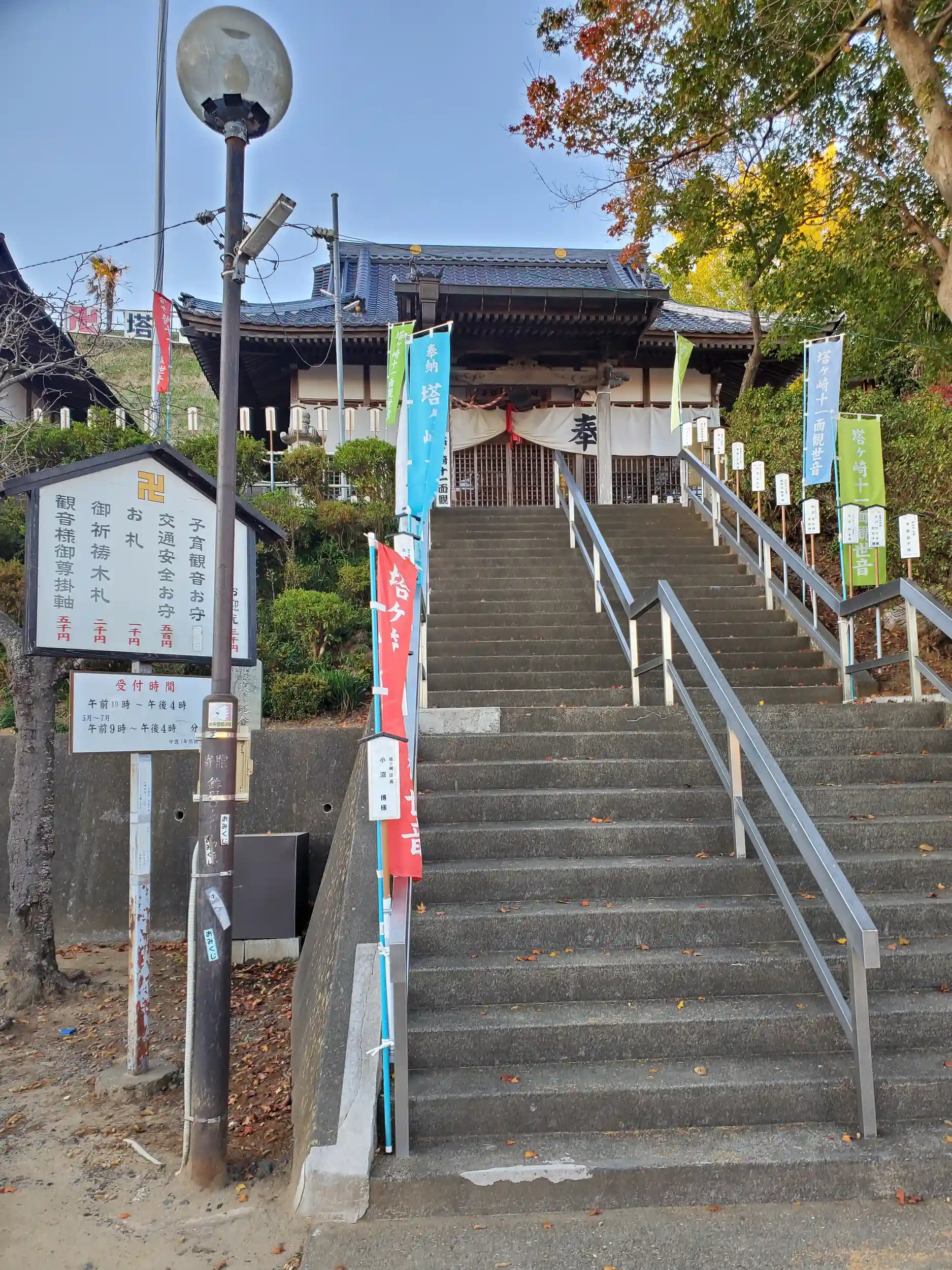 例によって御利益が安産・子育てなのですが(^_^;)、写真で見た時、崖の斜面に建つ立地と、階段を彩るカラフルな幟に惹かれて行ってみたくなりました。