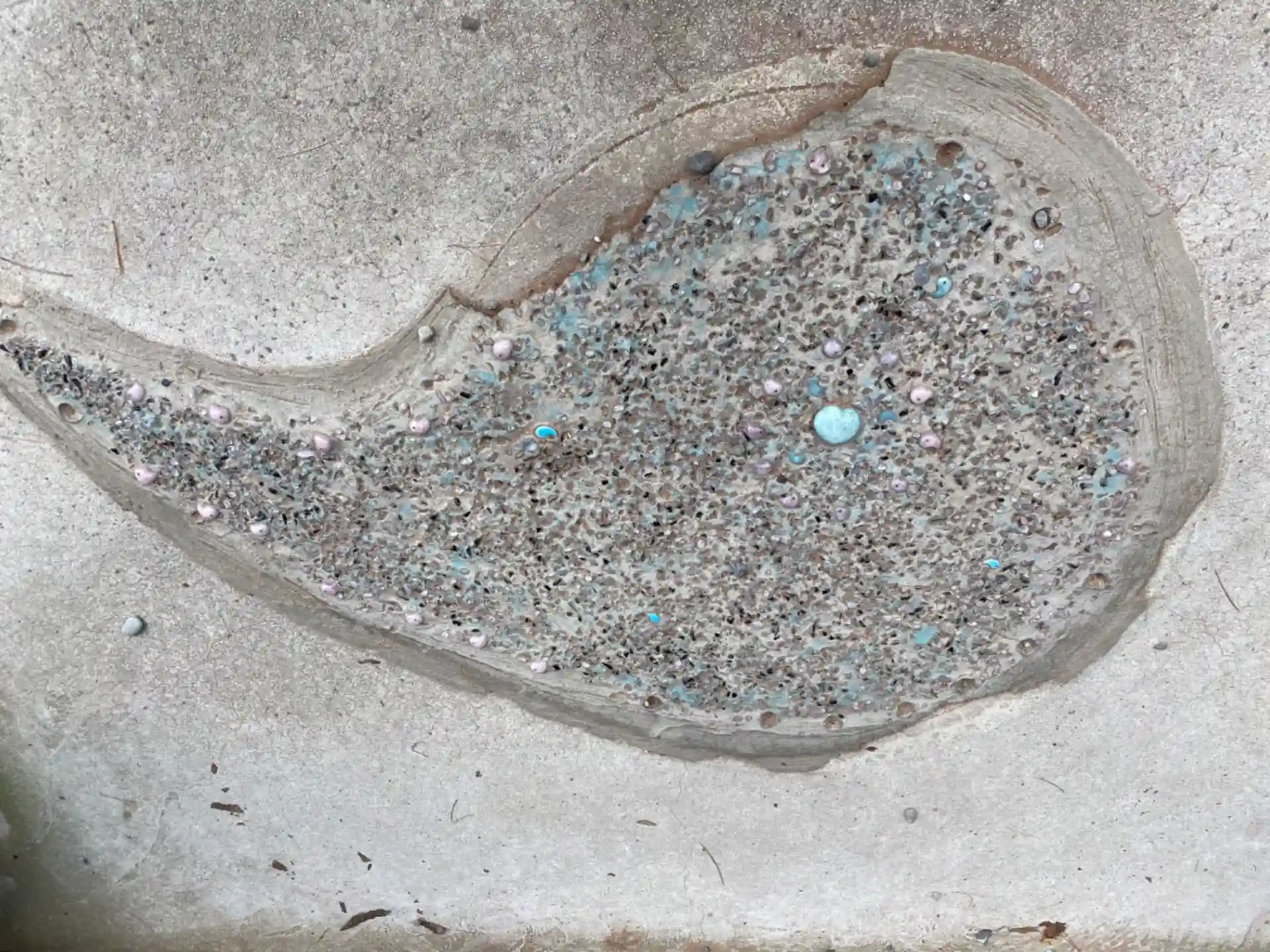 拝殿前に石が埋め込まれて よく見るとハート型🩵に周りにはカラフルな勾玉があしらわれて