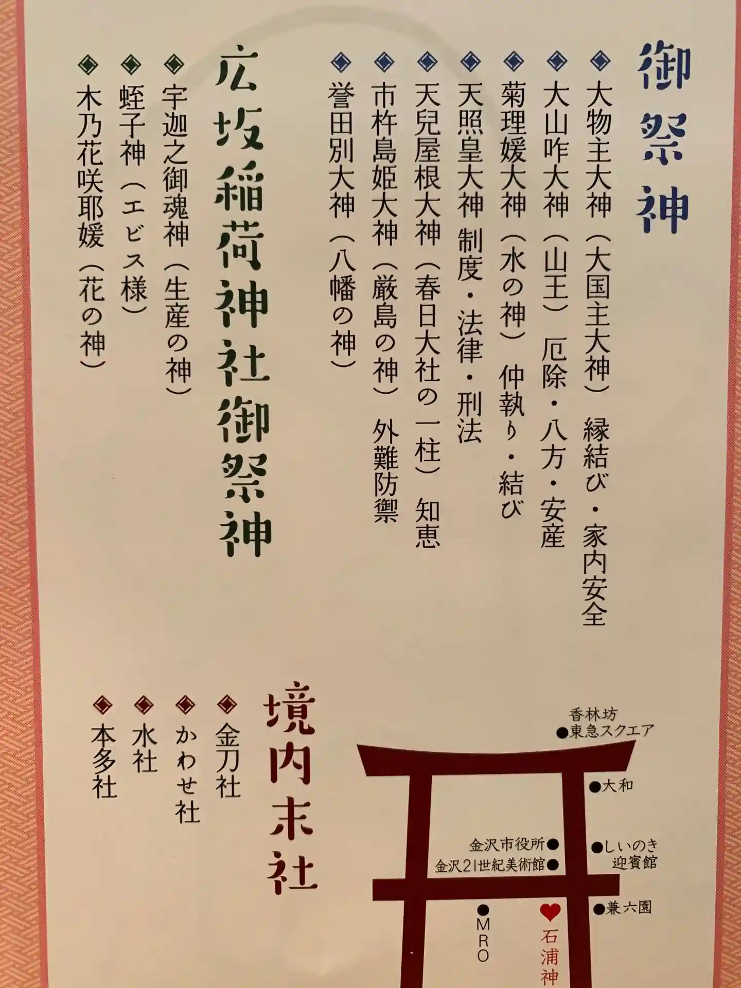 金沢城地の土地神として歴代藩主の崇敬も厚く、2台藩主利長は社殿を、5台藩主綱紀は安産祈願をしたそうです。
