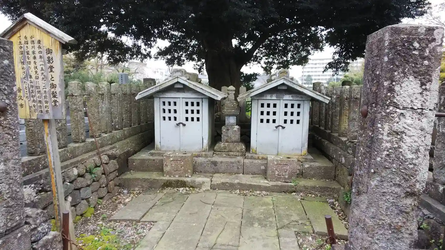 前田利家が徳川家康を伏見に訪問する際、死を覚悟していたとされ、自らの遺髪と自画像を埋めたと云われる