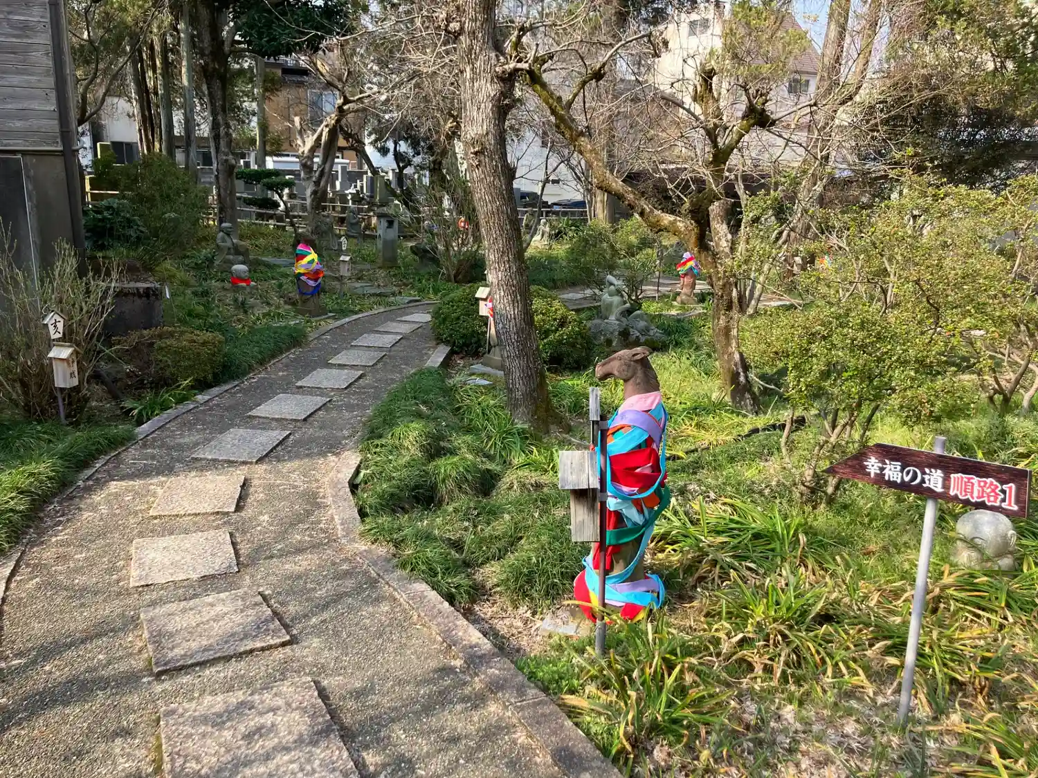 幸福の道の庭園入口。 ここを2週して、最後の1週でそれぞれの干支にお詣りしてから不動明王様に祈願すると叶うと言われています。