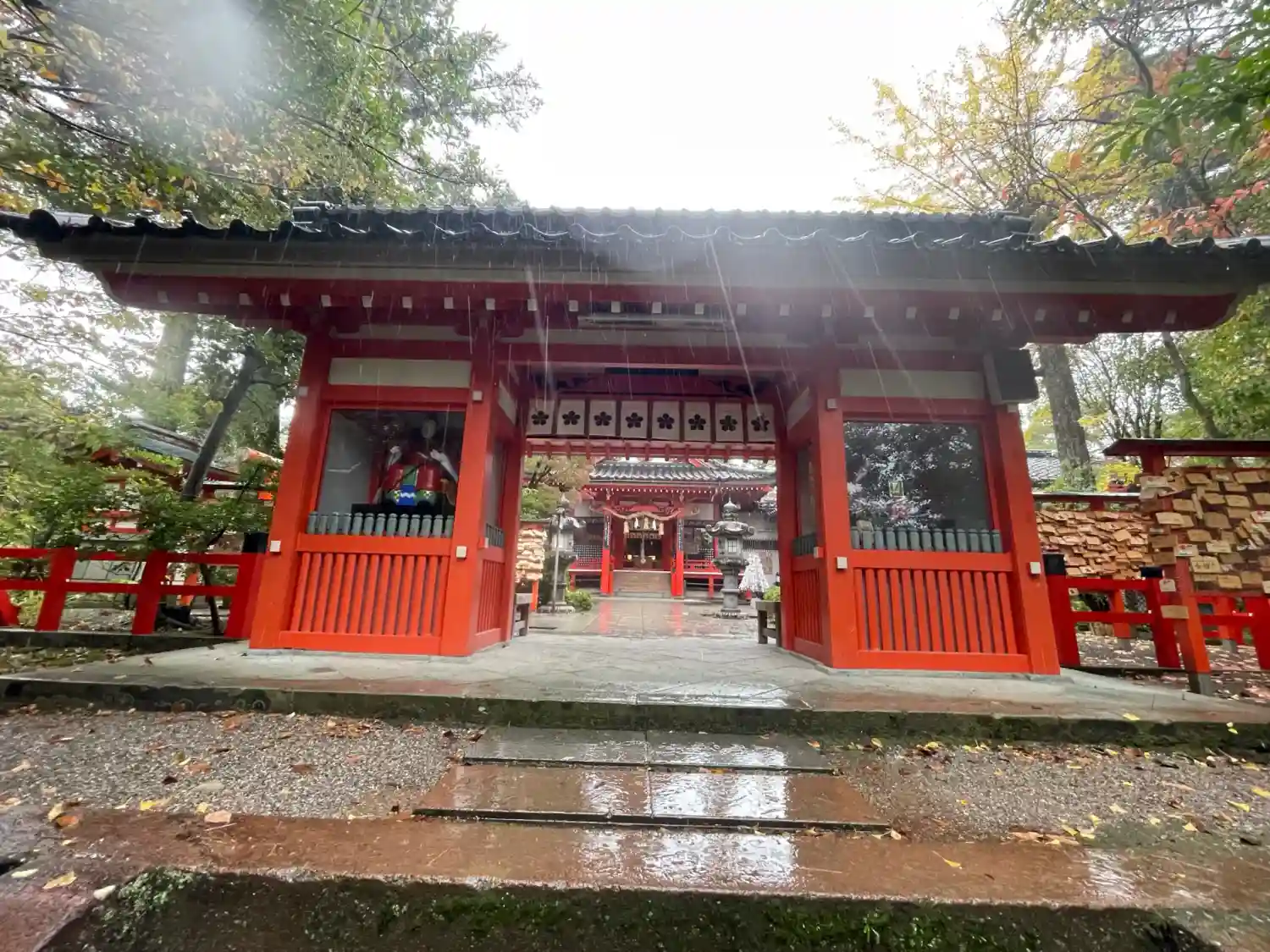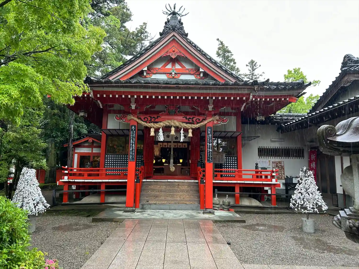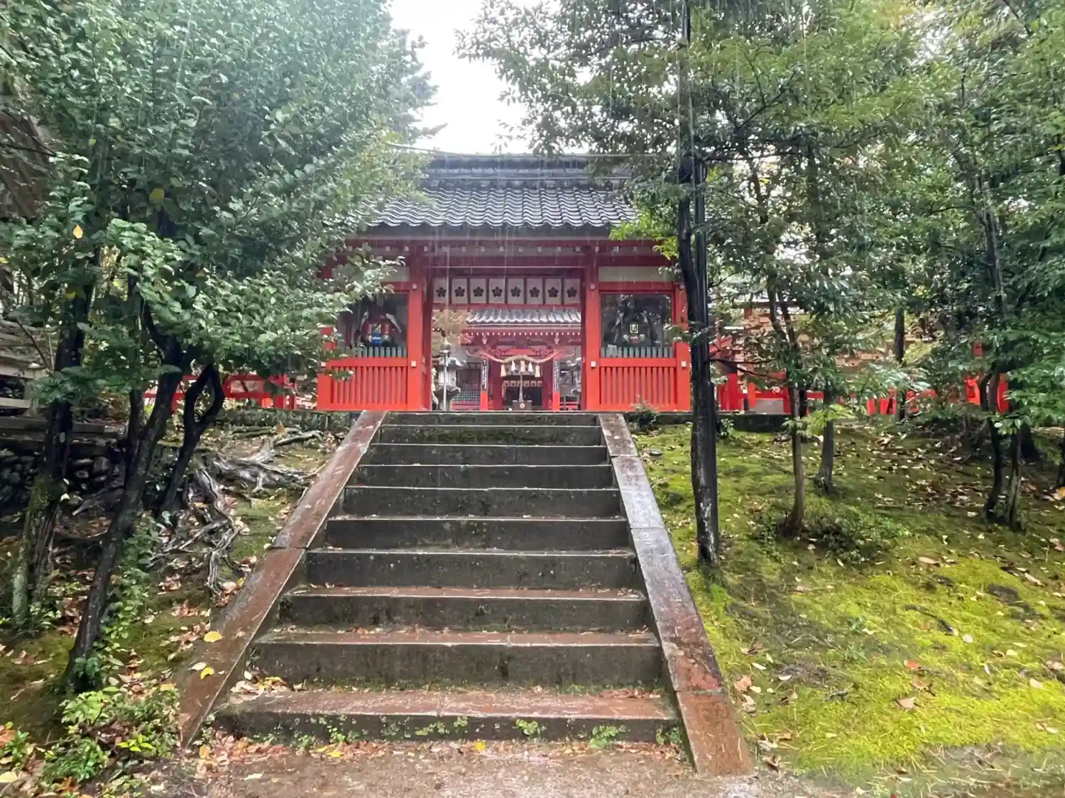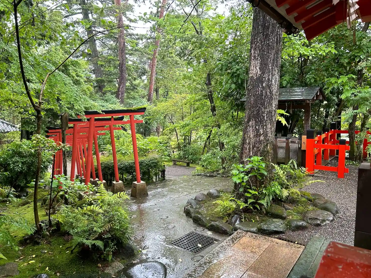 雨に打たれた緑が生き生きとし、朱色の鳥居や社…