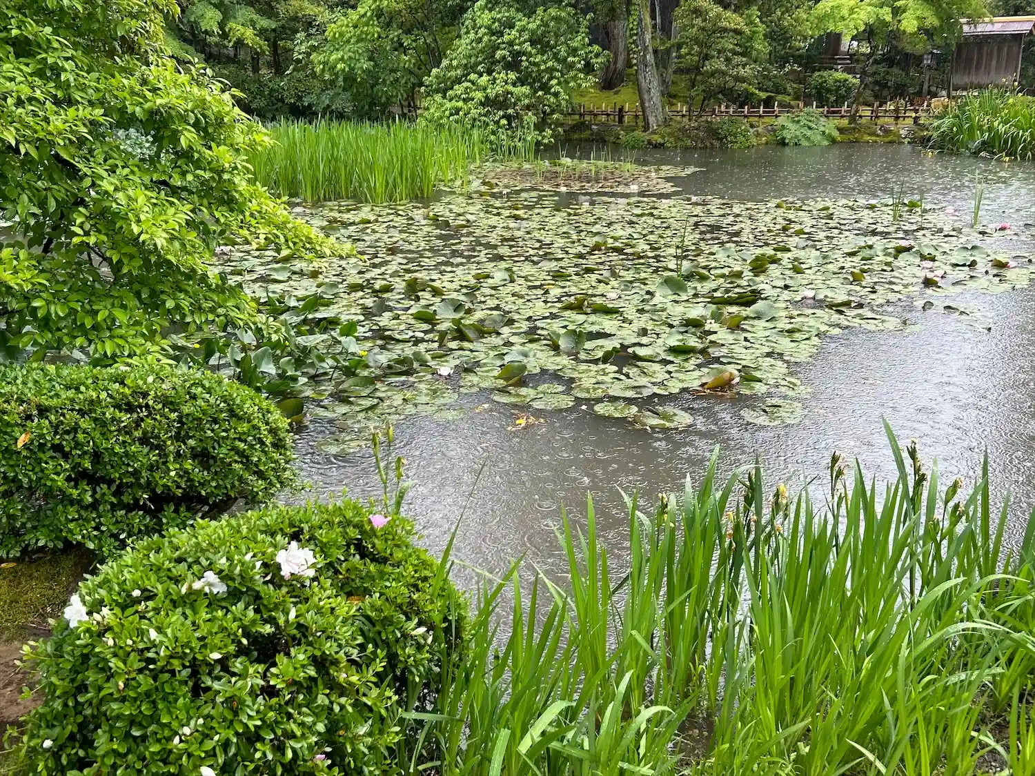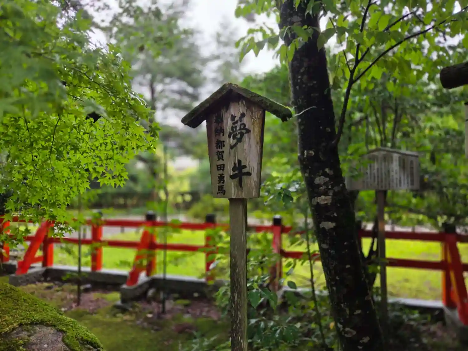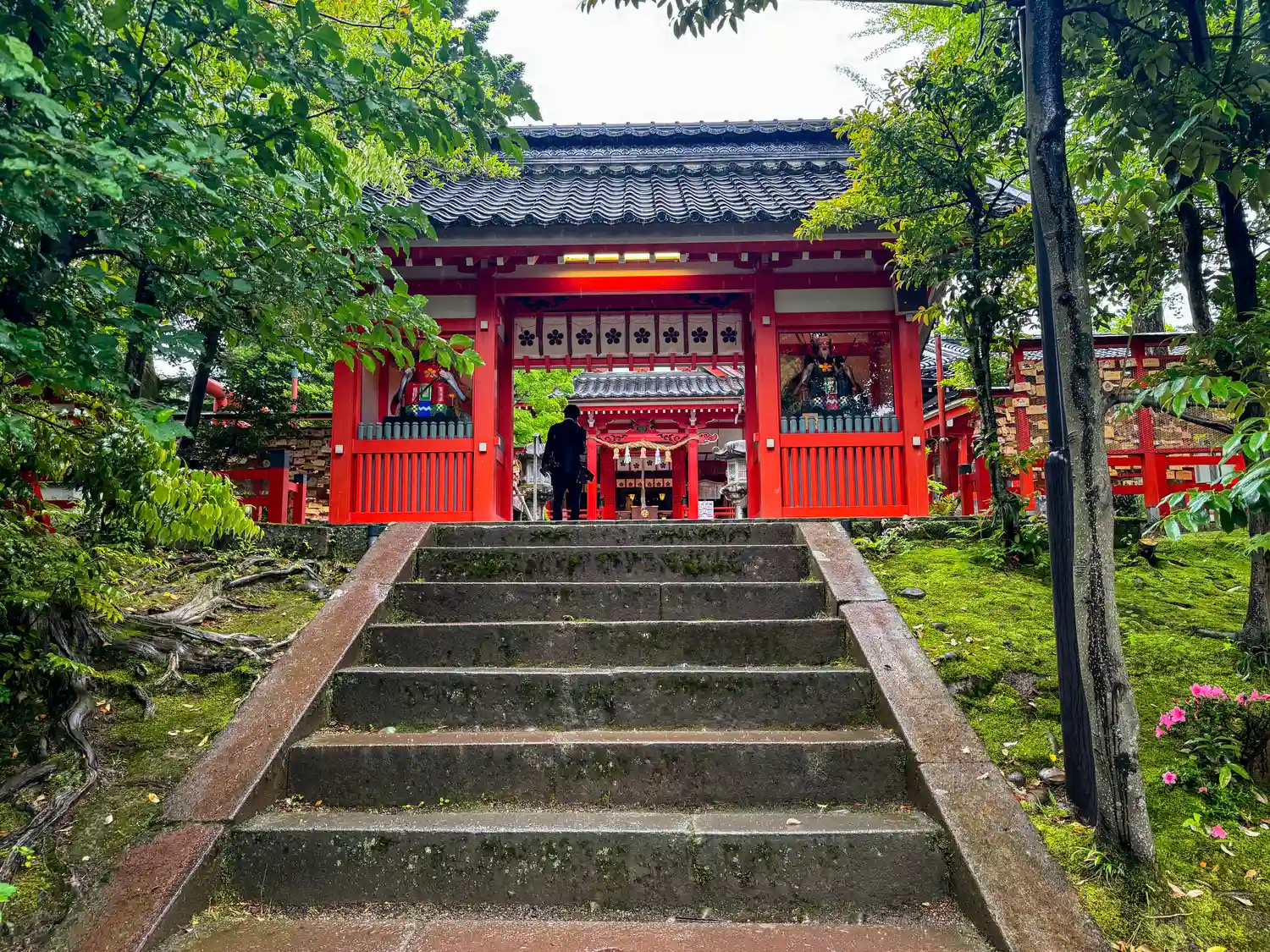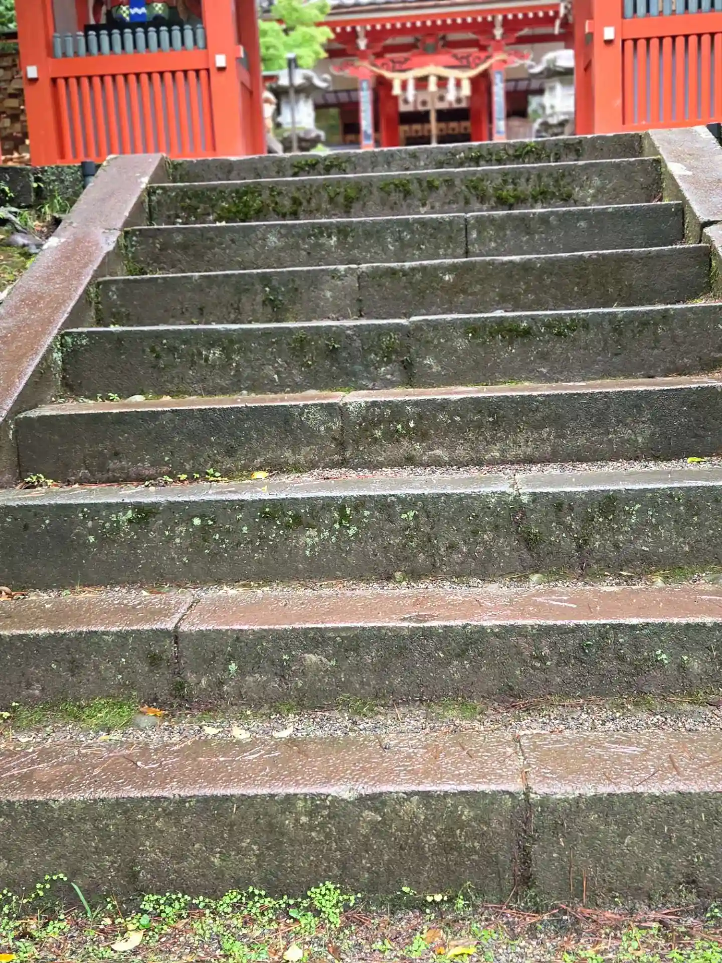 雨に打たれた緑が生き生きとし、朱色の鳥居や社…