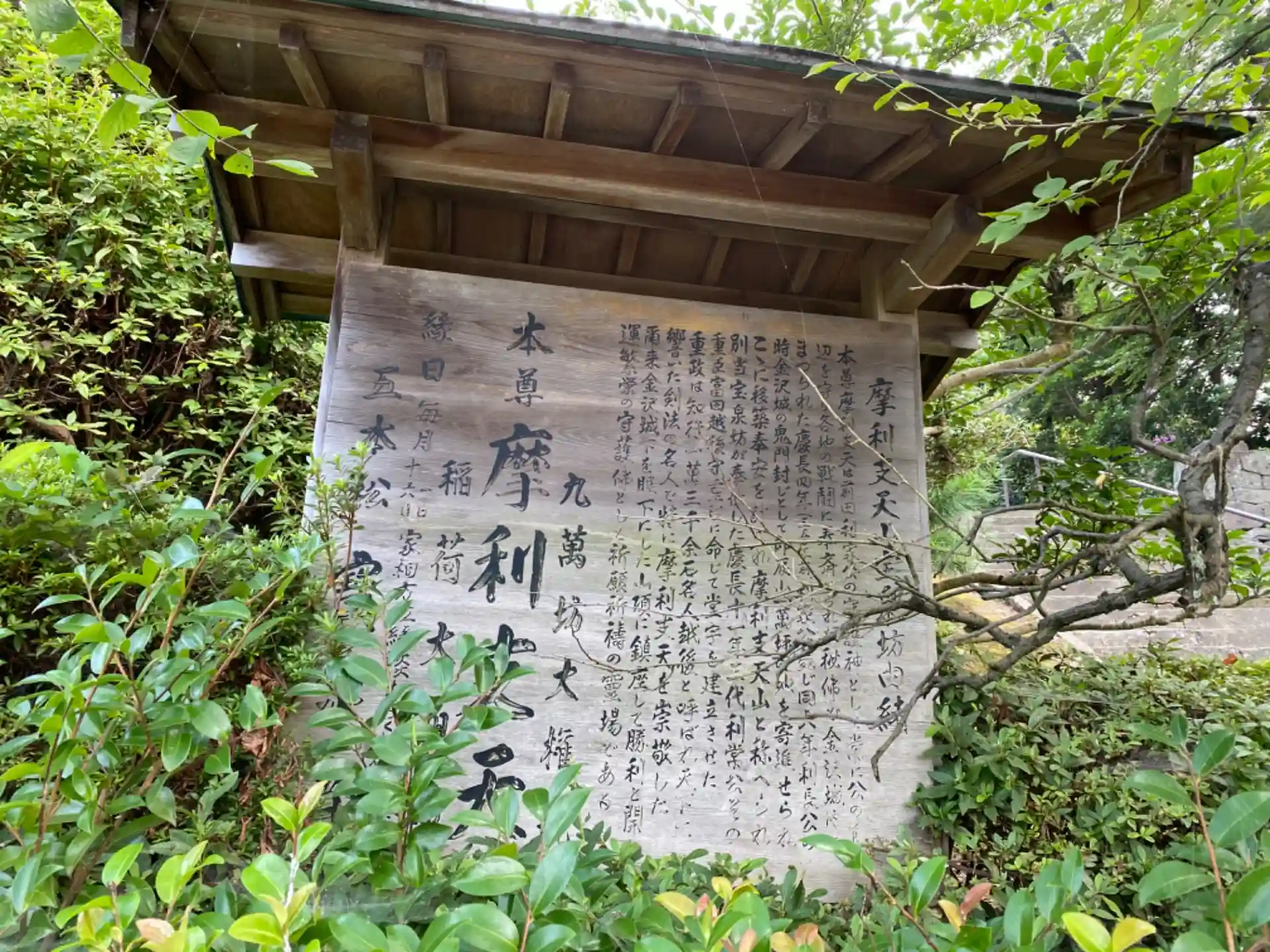 境内では、たくさんの石仏が所々にあり、石段を登りきると金沢の街が一望できます。