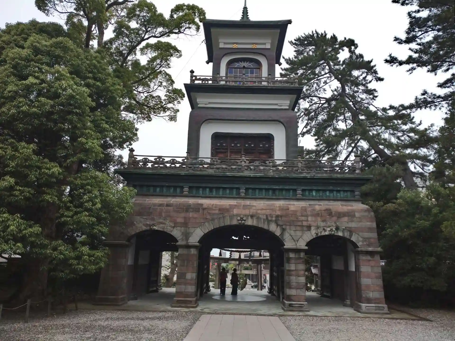 晴れていればもっと美しかったと思われる和漢洋折衷のギヤマン張りの神門をくぐって参拝。境内には名将前田利家公の銅像もありました。