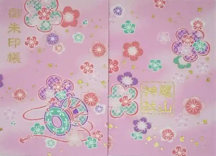 表面には明治8年に建設された神門が鮮やかに描かれています。左上に金色で「御朱印帳」の文字神門の避雷針の上の部分に御神紋の梅紋が刺繍されています。
