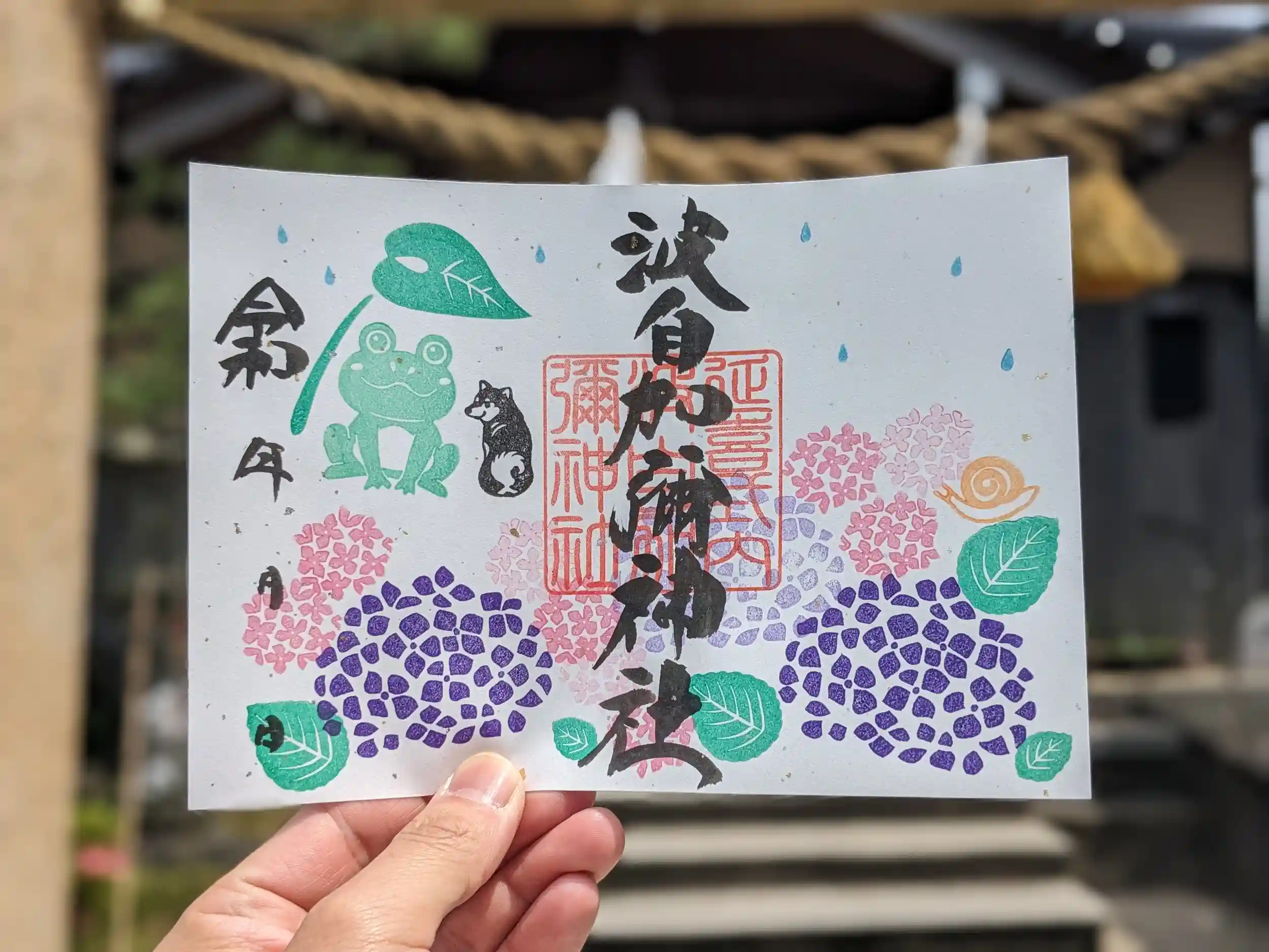 色鮮やかな『アジサイ』『カエル』『神主犬 宗二郎』を配置しました。