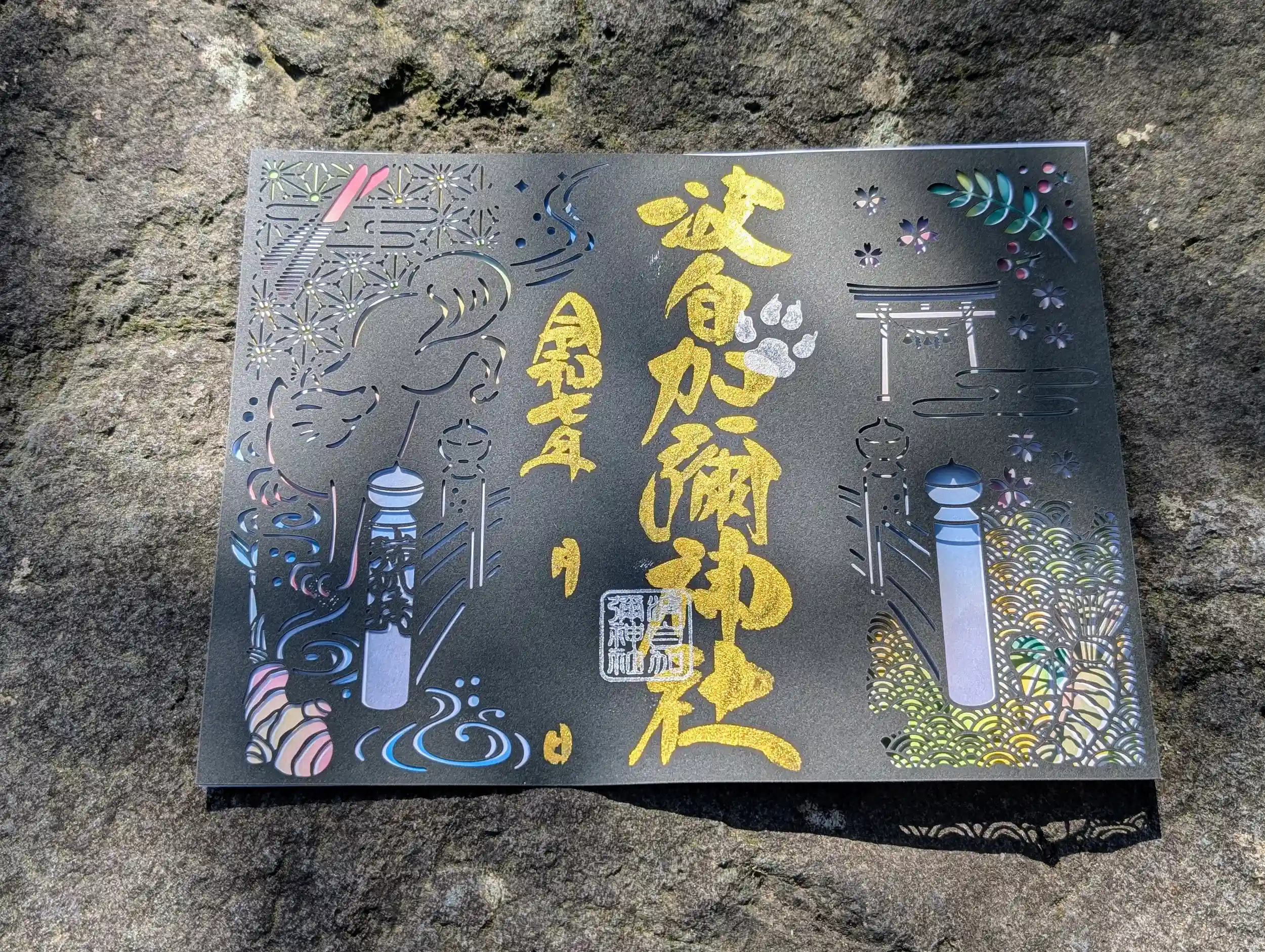 黒色の切り絵台紙にカラフルな台紙を組み合わせており、2枚で1つの御朱印です。