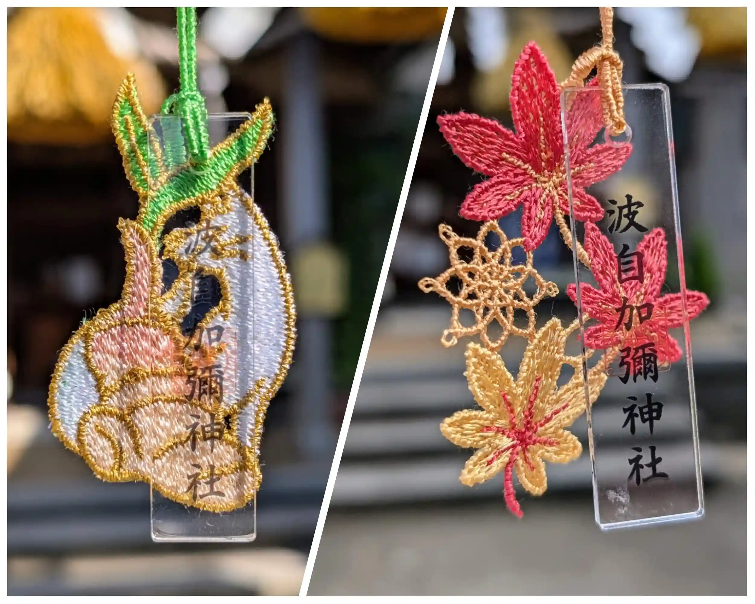 季節を彩る花や葉のレースをあしらったお守りです。