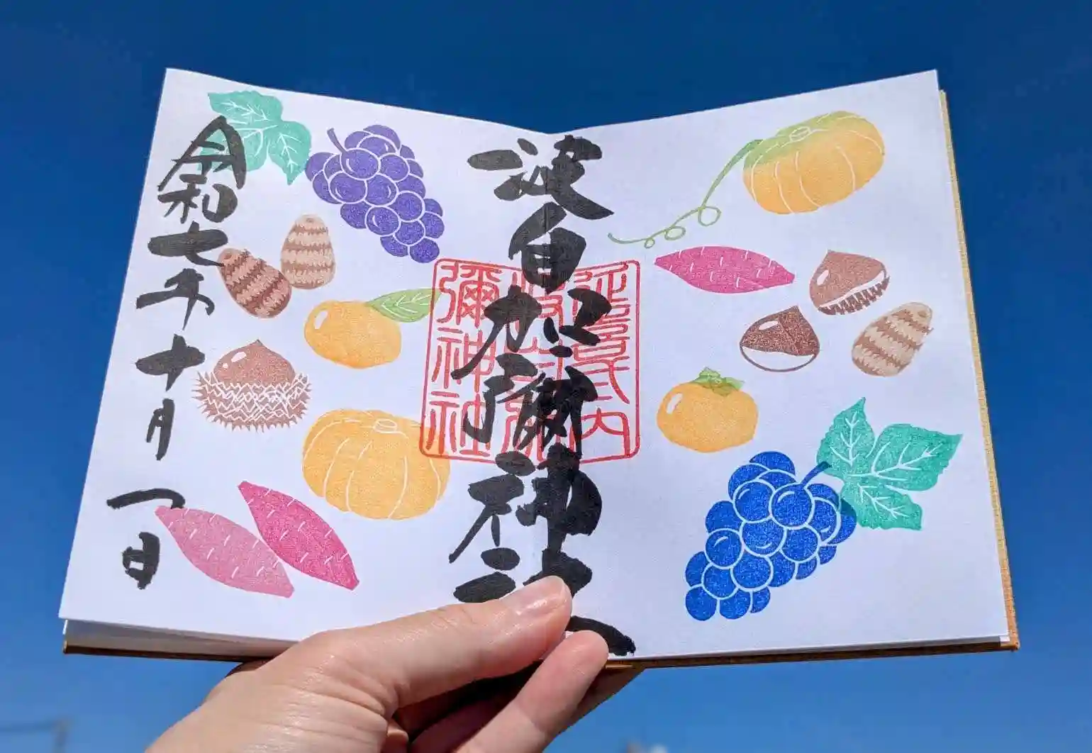 ぶどう、柿、栗、きのこ…秋の恵みを描いた見開き御朱印が登場しました。
