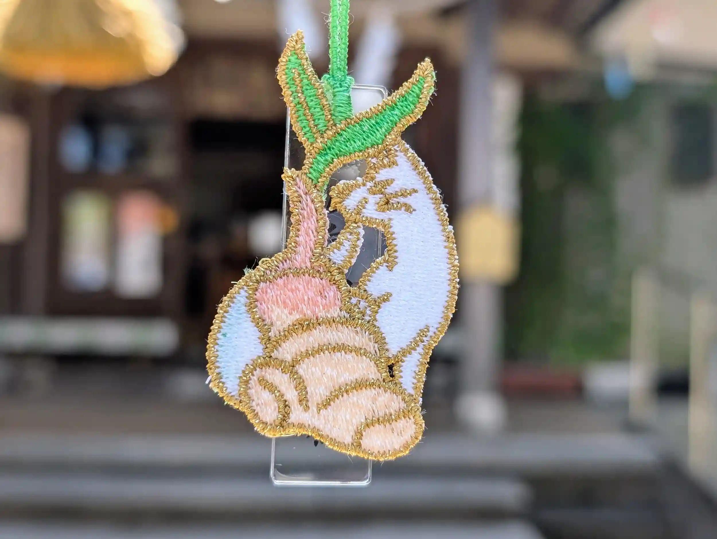 レース素材を使用したお守りで、『白狐』と『新しょうが』が描かれております。 四季開運守の様に透明なお守りと一緒にして授与します。