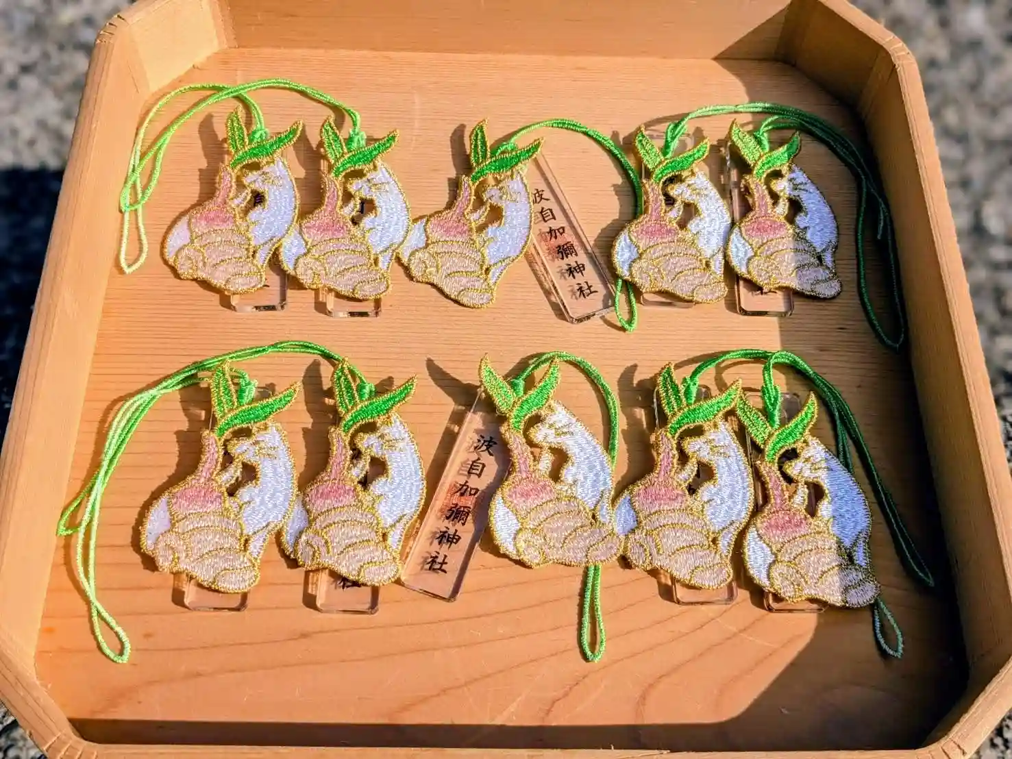 レース素材を使用したお守りで、『白狐』と『新しょうが』が描かれております。 四季開運守の様に透明なお守りと一緒にして授与します。