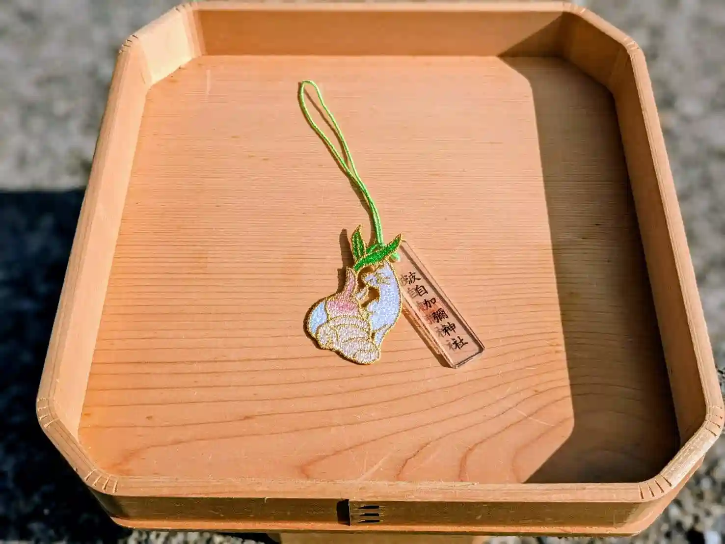 レース素材を使用したお守りで、『白狐』と『新しょうが』が描かれております。 四季開運守の様に透明なお守りと一緒にして授与します。
