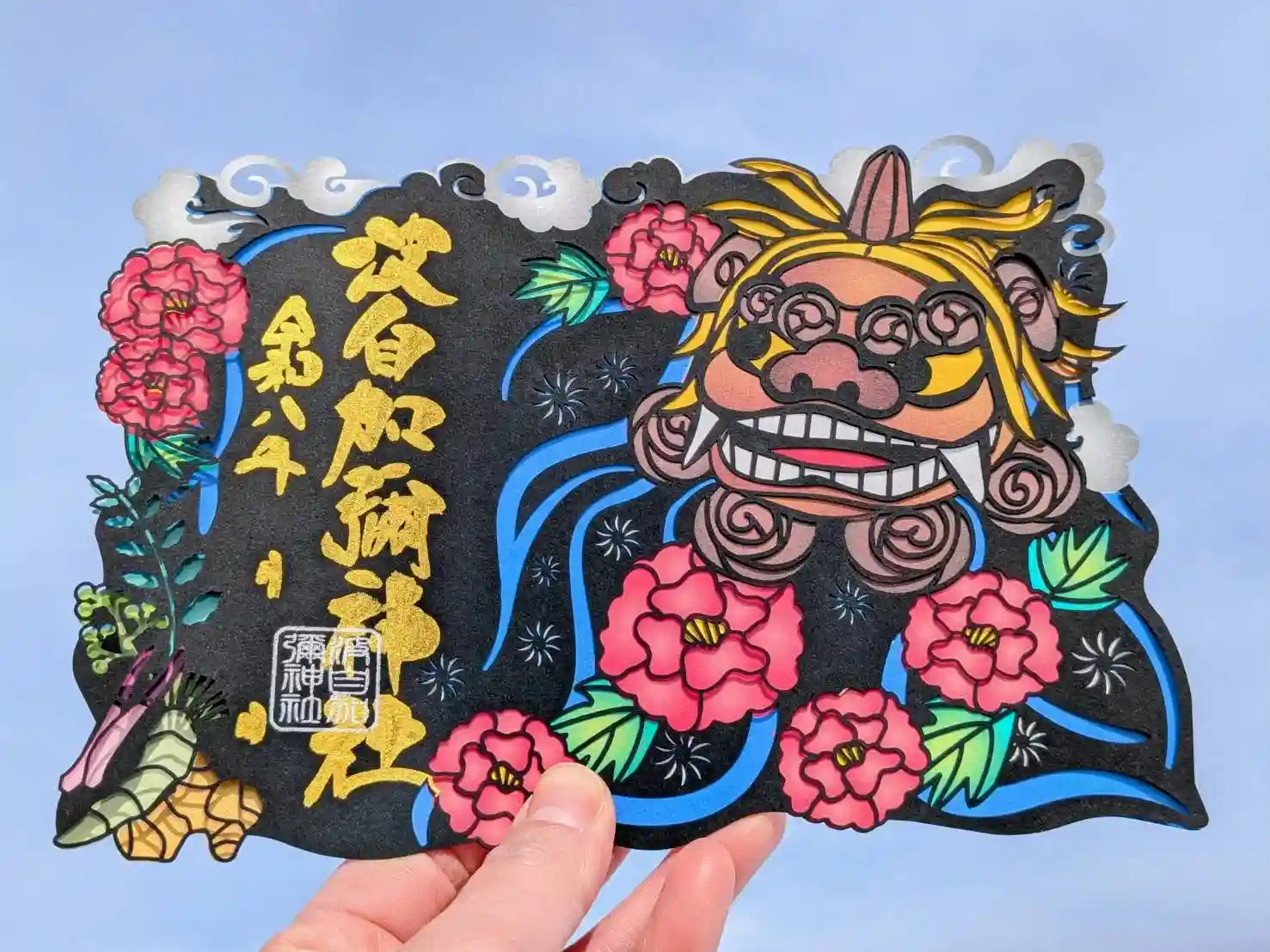 加賀友禅の大輪の牡丹と獅子舞を描いた御朱印帳を授与していただきました。