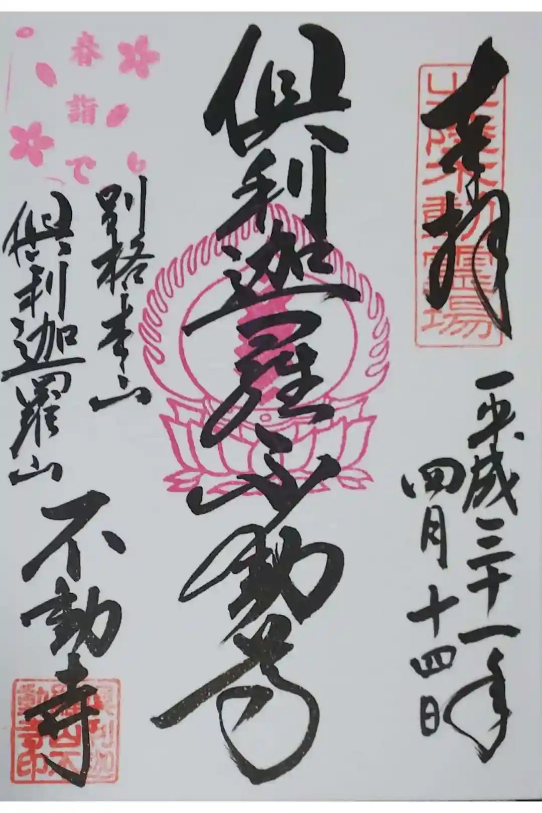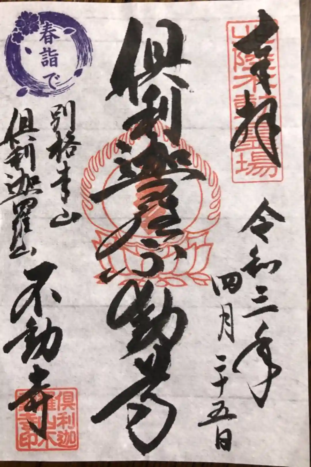 倶利迦羅不動寺山頂本堂の御朱印(春詣で)