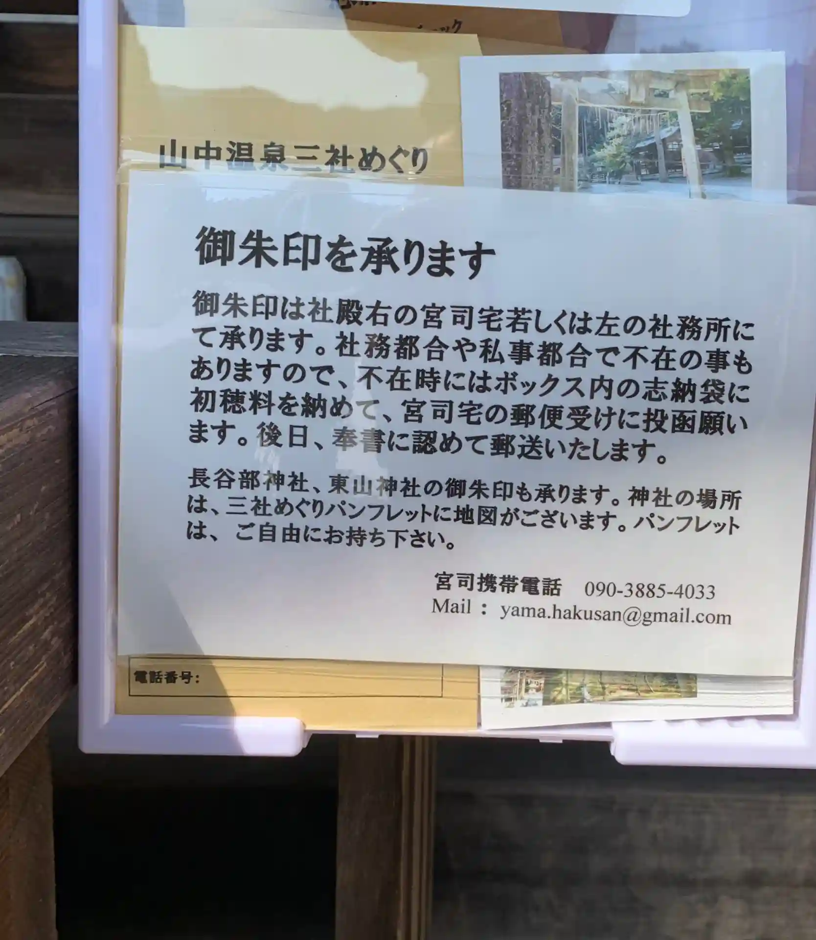 社務所はお留守、封筒に初穂料を入れて宮司様宅のホストに入れておくと郵送していただけるそうです。
