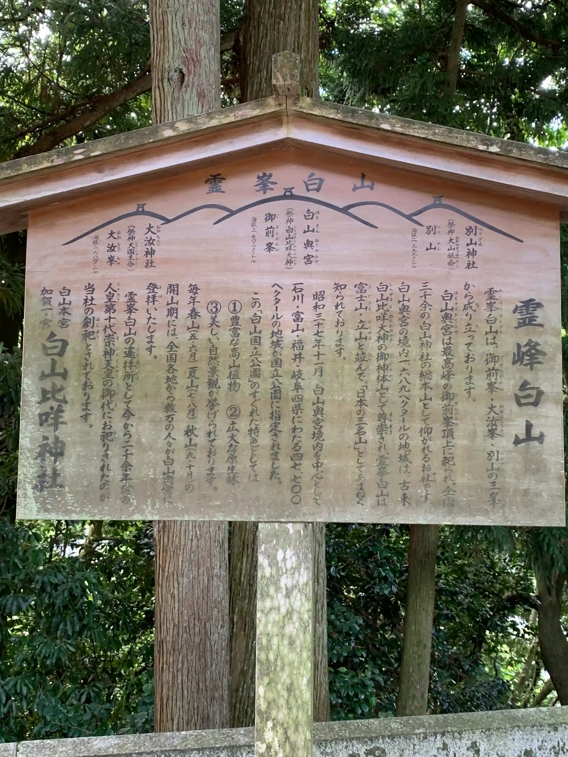 養老元年(七一七)僧泰澄によって白山を開山されて以来、修験道が盛んとなり、加賀・越前・美濃の三馬場が開かれて隆盛を極めました。その後、旧社地は、古宮址安久濤の森(現在古宮公園)でありましたが、約五三〇年前の文明十二年(一四八〇)の大火によって四十有余の堂塔伽藍が悉く烏有に帰しましたので、末社三ノ宮の鎮座地である現在地に遷られ、本宮鎮座の地と定めて今日に至りました。明治維新の後は「下白山」を本社、「白山天嶺」を奥宮とし、 国幣中社 として国家から特別の重い待遇を受けましたが、終戦後の今日では、全国に奉斎されている三千余社の白山神社・白山社の総本宮として白山信仰の中心をなしております。