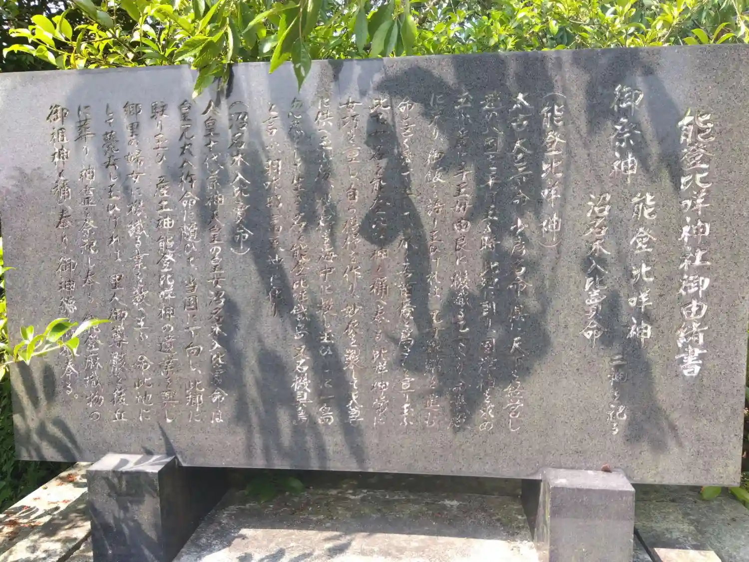 古事記では沼名木之入日売命、日本書紀では渟名城入姫命。古事記・日本書紀ともに、第10代・崇神天皇と妃オオアマヒメの命の子とする。古事記ではオオイリキの命という兄がいる。同じ中能登町の能登部神社のご祭神だ。また彼女は日本書紀だと、ヤマトオオクニタマの神との関係で重要な役割を演じる。
