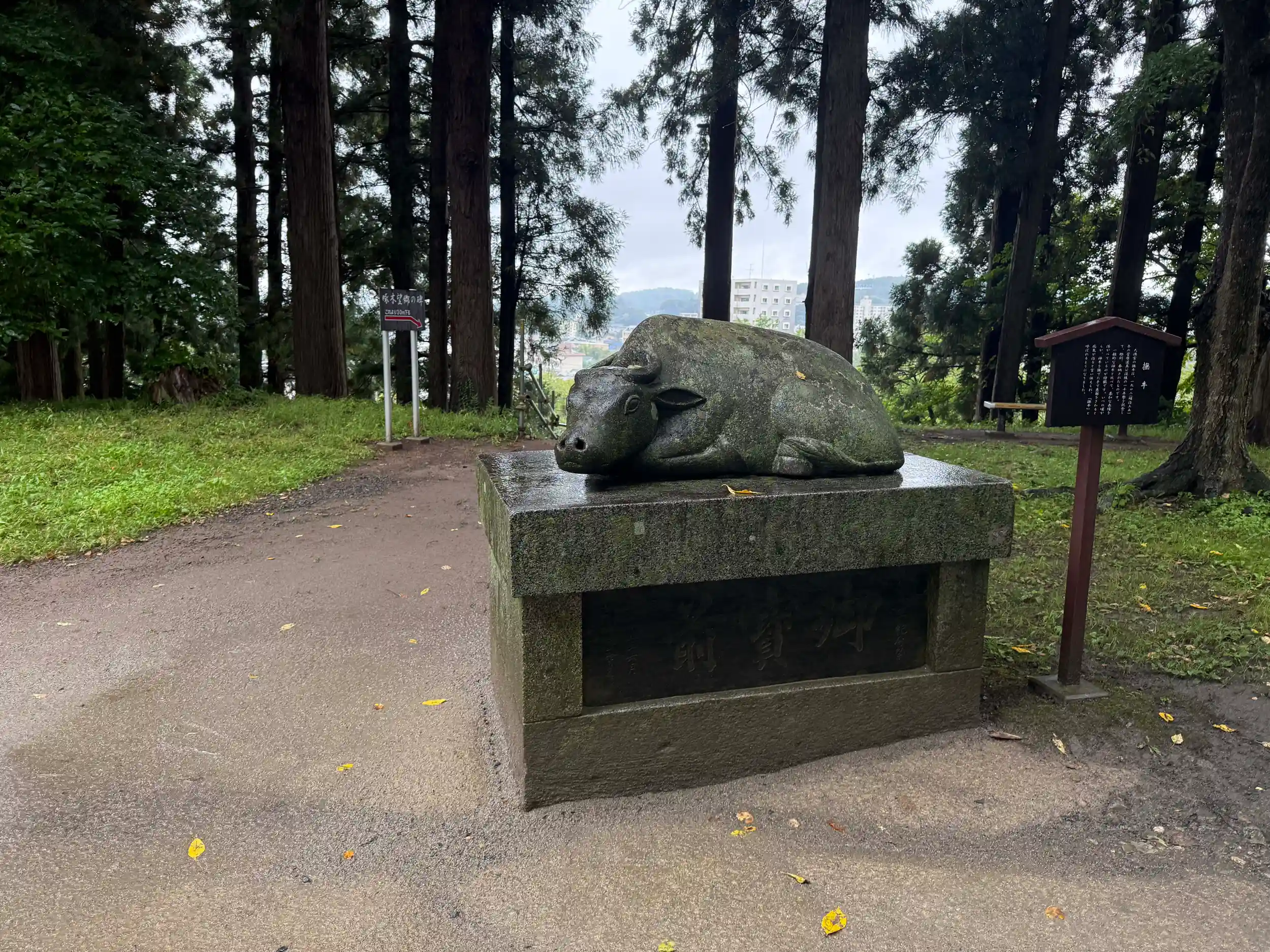 鳥居の下にある大きな岩は弁慶が力試しに持ち上げたと伝わります。