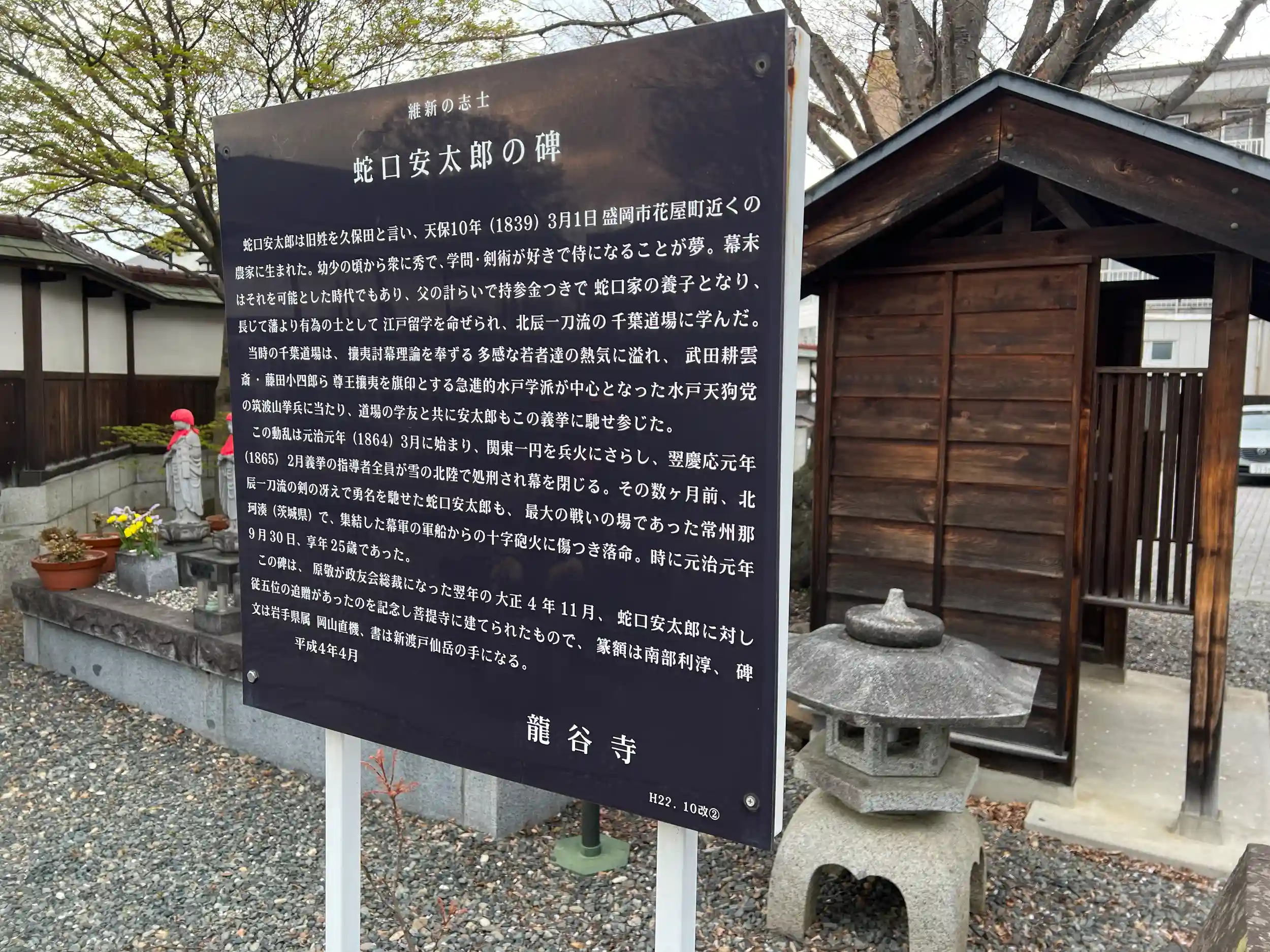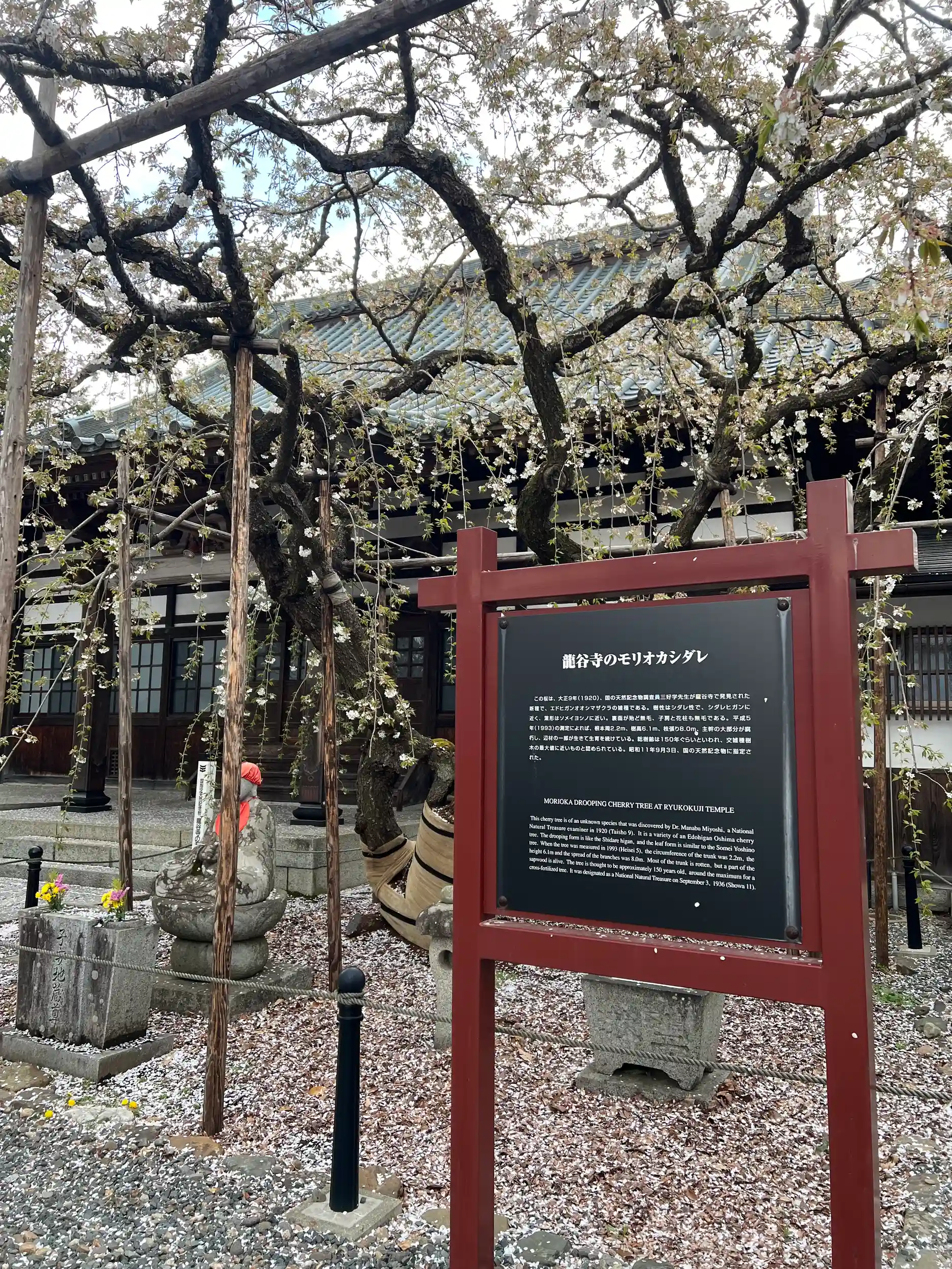 龍谷寺(りゅうこくじ)は明治4年から明治28年まで 石川啄木の母方の伯父、 葛原対月(かつらはらたいげつ)が住職だったお寺です。 対月の弟子であった啄木の父、 一禎(いってい)と対月の妹であった啄木の母カツが結ばれたのもこの寺でした。 対月は早くから和漢の書を修め、 易学、茶道に通じていましたが、特に和歌に関しては一禎に大きな影響を与えました。 少年時代の啄木はしばしばこの寺を訪れ、 伯父の対月から詩歌の手ほどきを受けたといわれています。 境内にあるこのモリオカシダレは国の天然記念物に指定されており、 春になると市民の目を楽しませてくれます。枝垂性のヒガンザクラとオオシマザクラ系のサトザクラの交配によってできたもの、と推定されています。