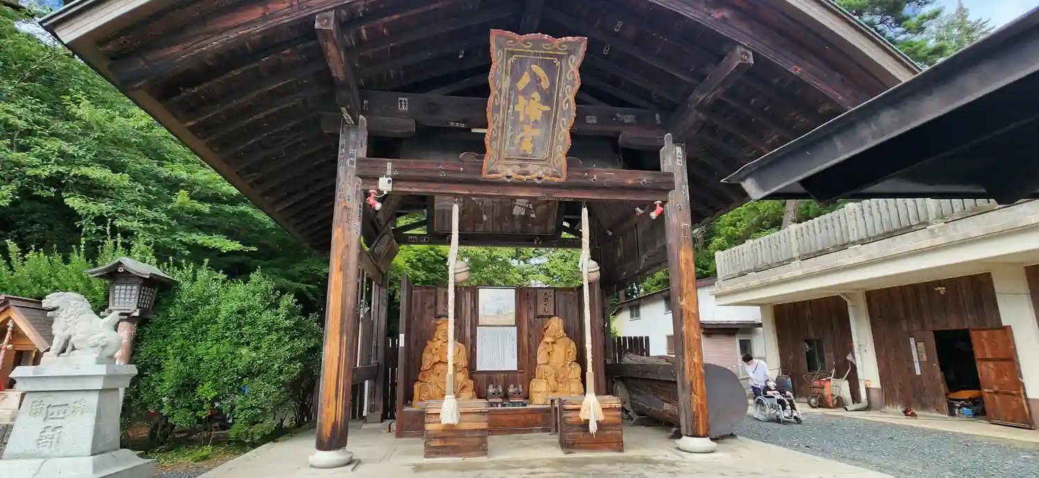 右奥にある大きな建物。扁額には「八幡宮」とあり、<大国さん>と<恵比須さん>の木像が鎮座している。