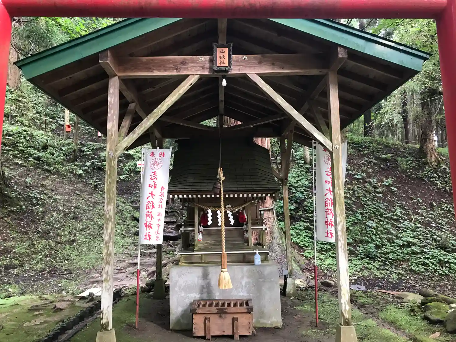 階段を数段登ると石製の<一の鳥居>。その後ろすぐの場所に真っ赤な<二の鳥居>。