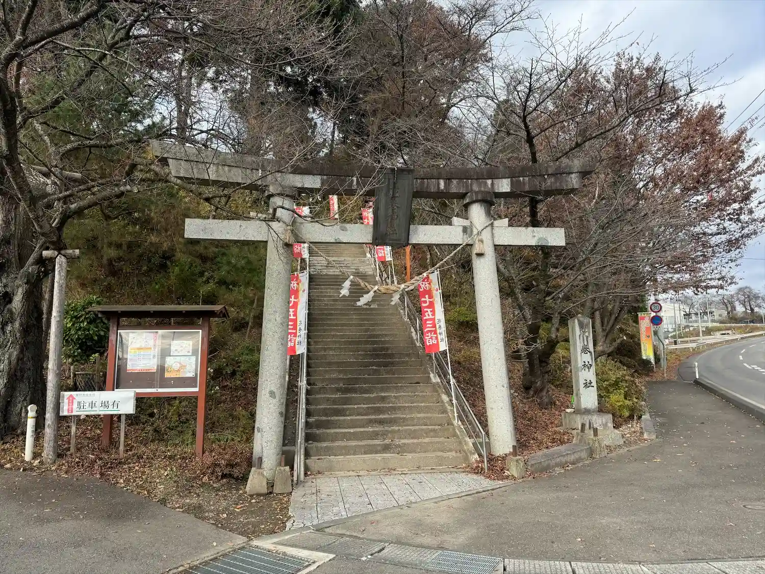 ちょっと小高い所にあり、駐車場は社務所前にあり道が狭いから注…