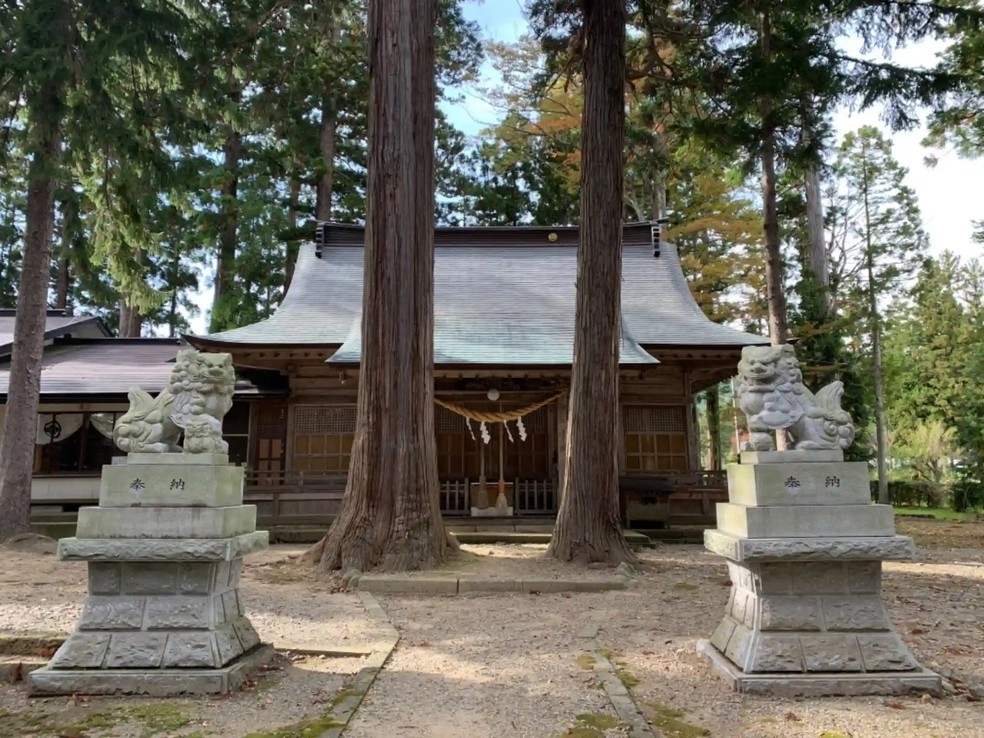 駐車場は裏にある公民館に停めての参拝となりました。鳥居をくぐると、宮司さんのお家のお庭を通って行く感じでした。杉の木が見事でした。