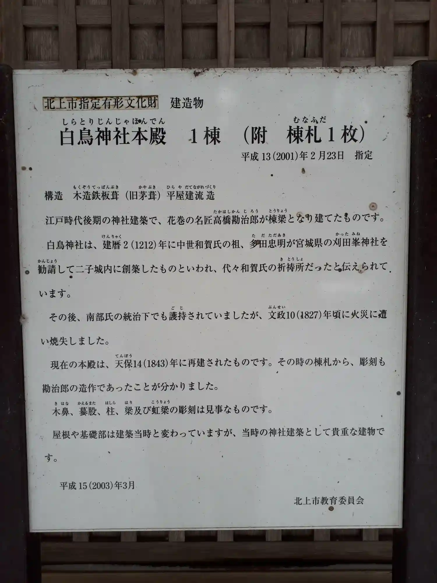 | ご由緒 | 鎌倉時代の1212年(建暦2年)、和賀郡の領主であった和賀氏の祖で式部大輔を務めた多田忠明によって二子城内に創建され、代々の守護神として尊崇を受けた。同氏の庇護は豊臣秀吉の奥州仕置まで続いた。 江戸時代以降、南部氏の統治下になり、1783年(天明3年)源正末より社領三石二人扶持を、また1843年(天保14年)には南部釿次郎より神号額を奉納され、同年に現在の社殿が再建されている。社殿の造営復興は二子通と万丁目通の住民が奉仕した。 |