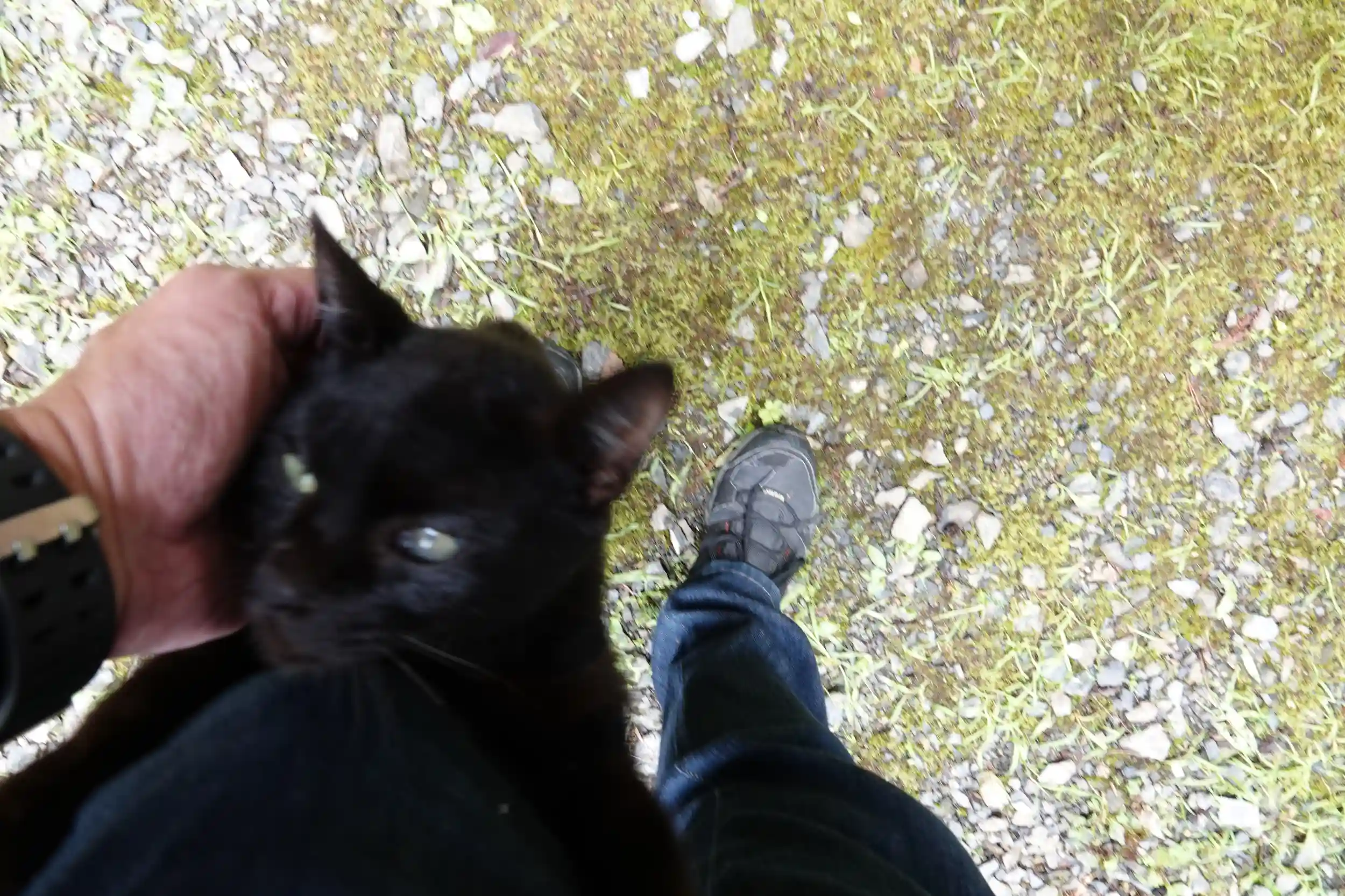参拝中、終始黒い猫が足元に寄り添い絡みつき、立ち止まると登ってきて座ると膝に乗ってきて、やけに人馴れしているんで神社で飼われている子か尋ねたら、