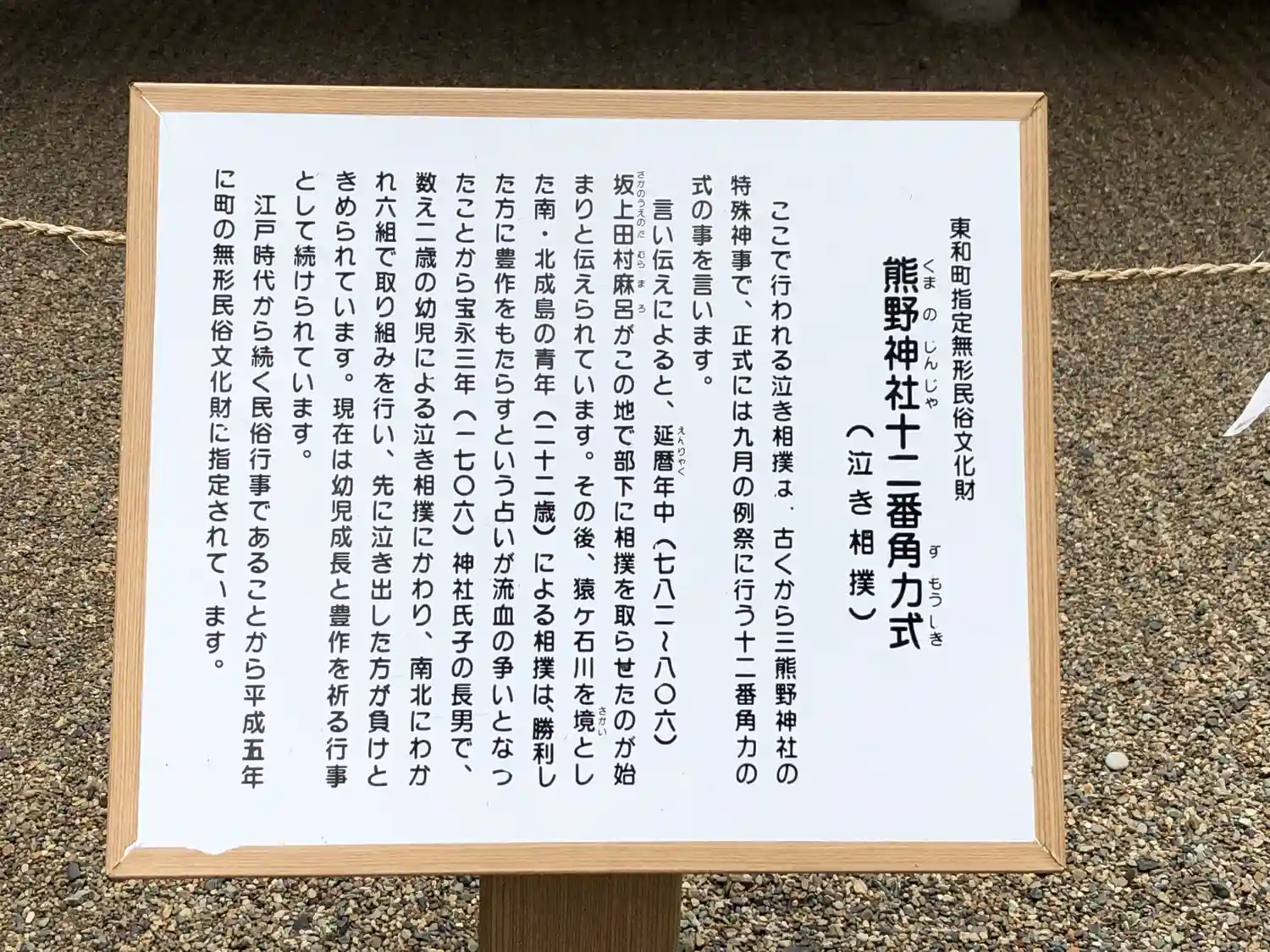 この地にも熊野信仰の神社がありました。坂上田村麻呂ゆかりのようです。赤ちゃんの泣き相撲があり、土…