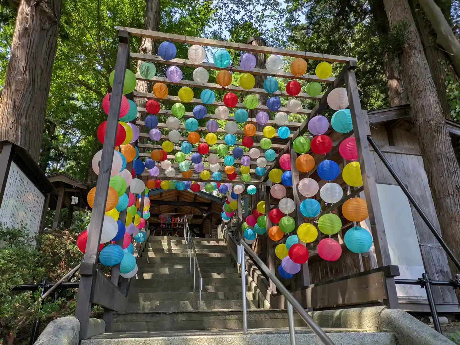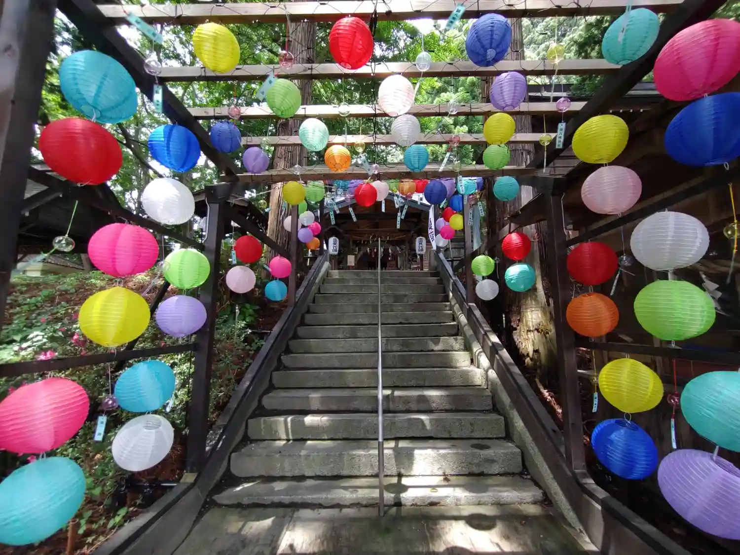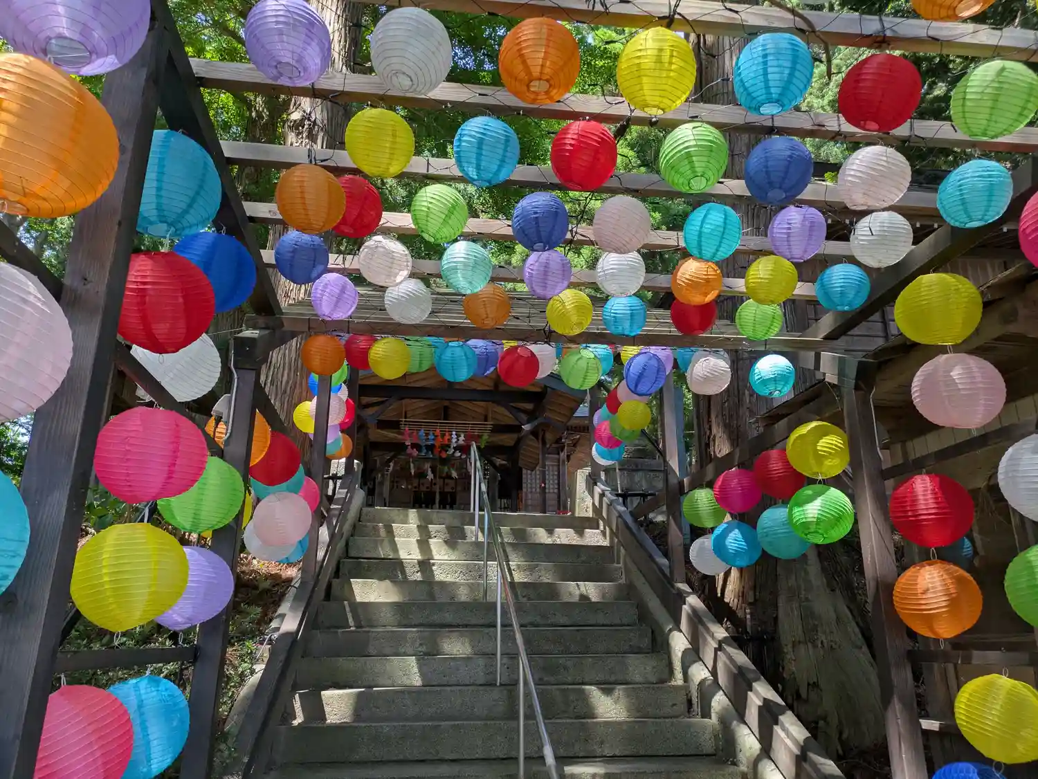 階段の途中にカラフルな提灯が!