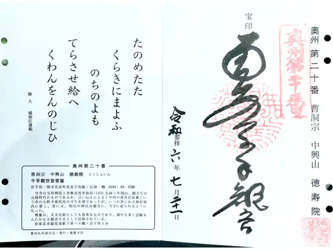 徳寿院は、長禄3(1459)年に金沢の稲荷山宝持院三世磐喜周省大和尚が開山し、本尊として延命地蔵尊を安置しています。札所ご本尊の十一面観音菩薩は木造90㎝の立像で、作者・年代は不明ですが、精巧な作り、徳寿院がこの観音様を護持するようになったのは明治以降のことで、それ以前の縁起については不明ですが、享保年間(1716~1735)の頃、中村(花泉駅の西北地域)の小野家の守り本尊だったと言われています。