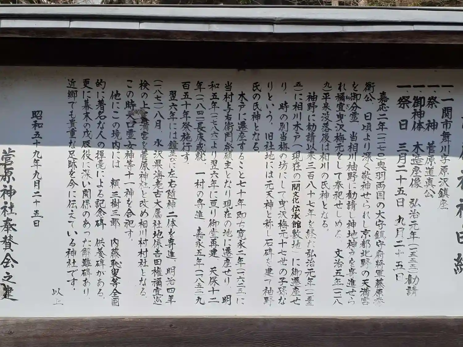| ご由緒 | 嘉応3年藤原秀ひら公が、京都北野天満宮より御分霊を当相川に勧請し、爾宜洩沢梅元をして奉祀せしめた。平泉没落後は相川の氏神として敬神を厚くしている。 |