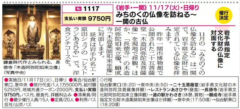 仙台駅東口(8:20)→泉中央(8:50)→二十五菩薩堂(岩手県文化財の木造阿弥陀及菩薩像拝観)→レストランあさひや(昼食)→長徳寺(岩手県文化財阿弥陀如来立像拝観)→道の駅かわさき(休憩、買物)→願成寺(岩手県指定文化財木造薬師如来坐像ほか拝観)→泉中央(17:50頃)→仙台駅東口(18:20頃)