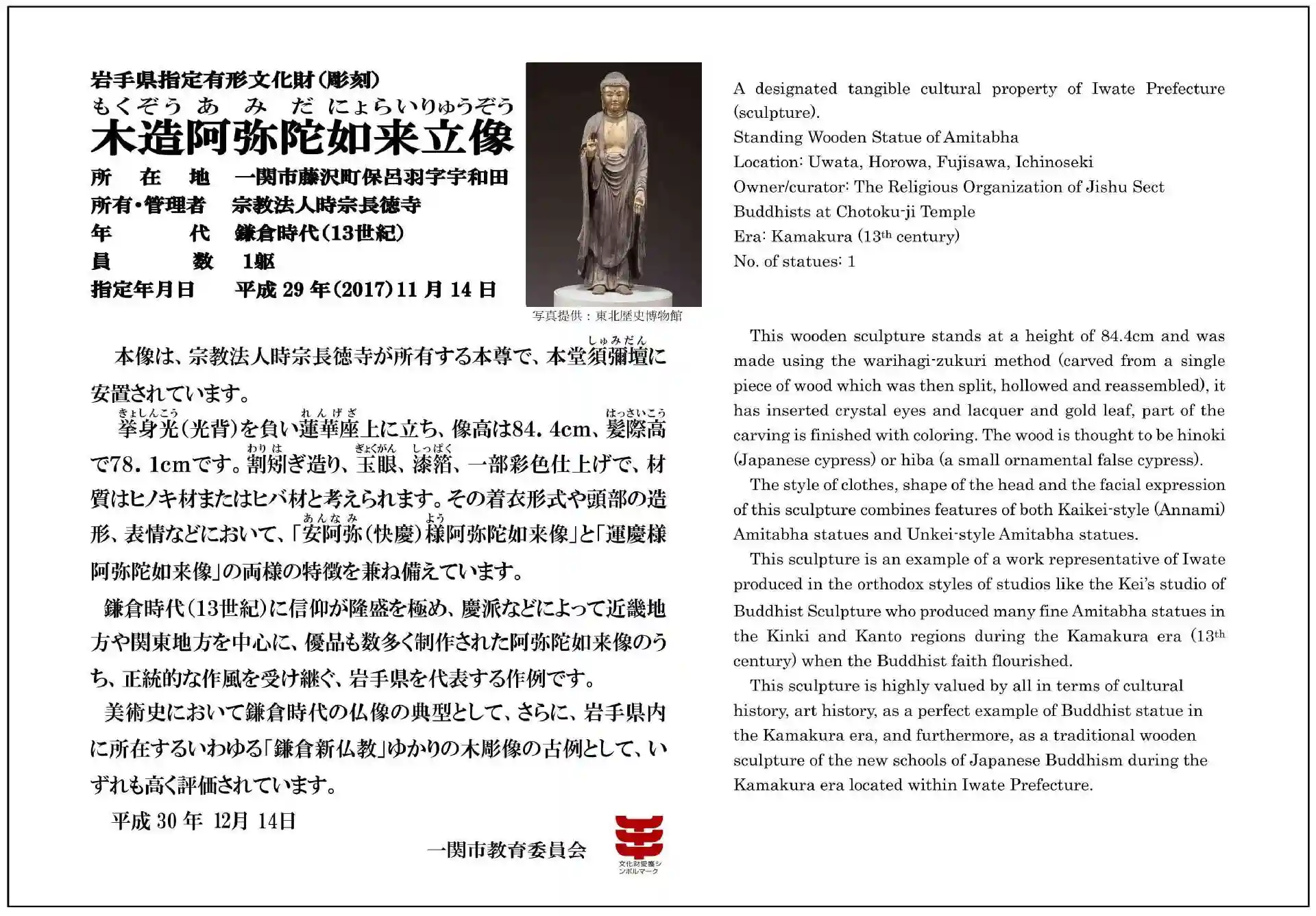 举身光(光背)を負い蓮華座上に立ち、像高は84.4cm,髪際高で78.lcmです。割矧ぎ造り、玉眼、漆箔、一部彩色仕上げで、材質はヒノキ材またはヒバ材と考えられます。 その着衣形式や頭部の造形、表情などにおいて、「安阿弥(快慶)様阿弥陀如来像」と「運慶様阿弥陀如来像」の両様の特徴を兼ね備えています鎌倉時代(13世紀)に信仰が降盛を極め、慶派などによって近畿地方や関東地方を中心に、優品も数多く制作された阿弥陀如来像のうち、正統的な作風を受け継ぐ、岩手県を代表する作例です。美術史において鎌倉時代の仏像の典型として、 さらに、岩手県内に所在するいわゆる「鎌倉新仏教」ゆかりの木彫像の古例として、 いずれも高く評価されています。