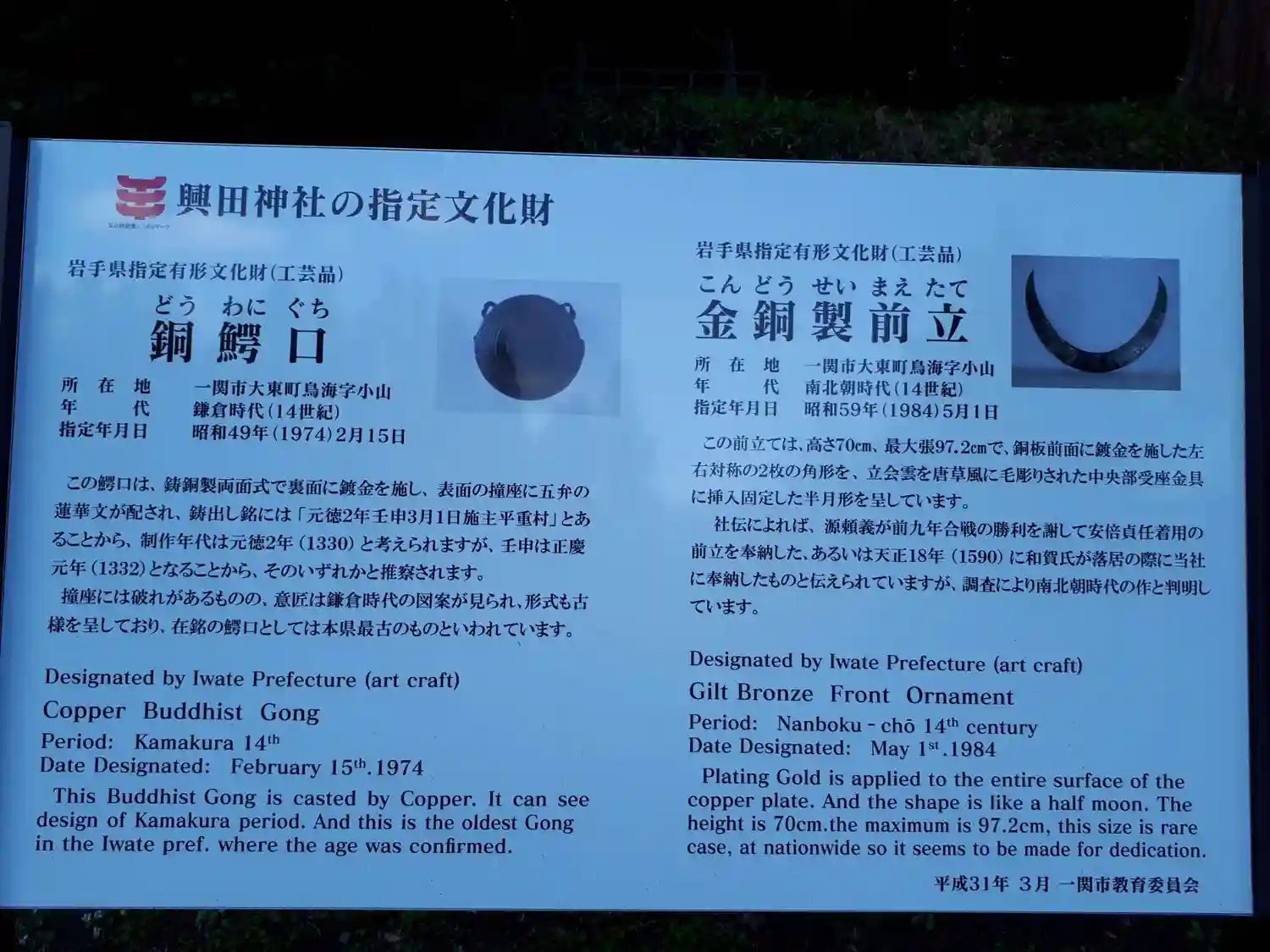| ご由緒 | 養老二年(718)鎮守府将軍大野朝臣東人が勧請。源頼義、葛西対馬馬守平高清の崇敬篤く往昔この山を妙見山と号し慈覚大師が弥陀薬師観音妙見摩利支天像を造立し妙見山法眼寺と号したが、明治の神仏分離令当時興田神社と改称現在に至る |