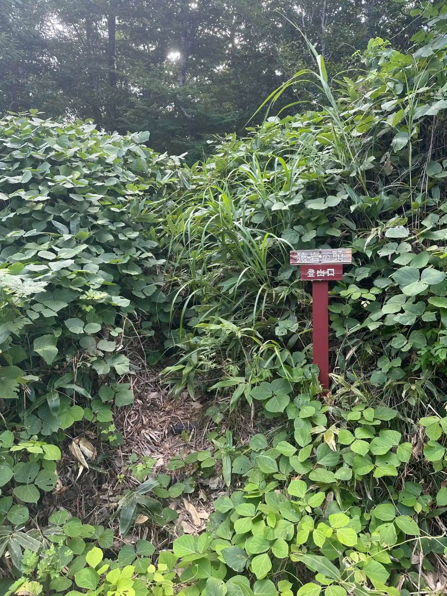 行き止まりのすぐ近くにあります。夏場はバランが茂って見えにくいですが、この看板の先に階段があります。