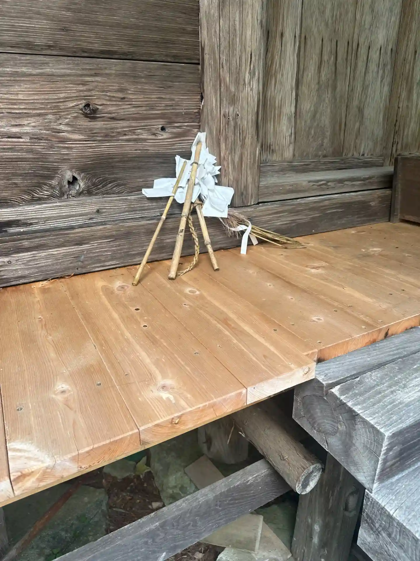 《拝殿の御幣》 👁チェックポイント‼️ 奥の院として残された当社はその後修験者が坐禅を組みにいらっしゃるとのこと。行者たちは山中での修行の際竹串に紙垂を挟んだ簡易な御幣を結界や御神体の代理として使っていることが多いので、拝殿に残されていたこの御幣もその用途だったのかもしれません。