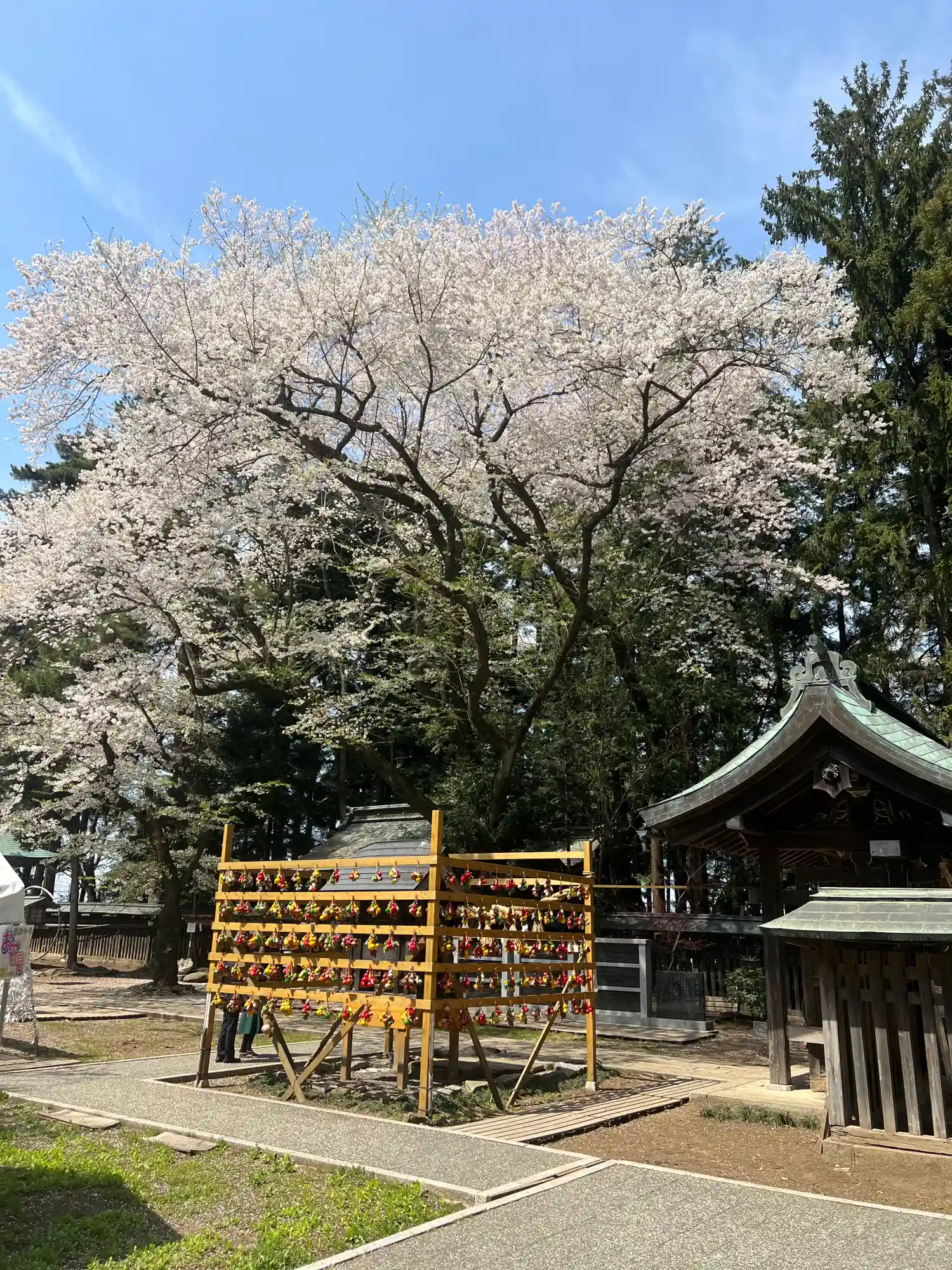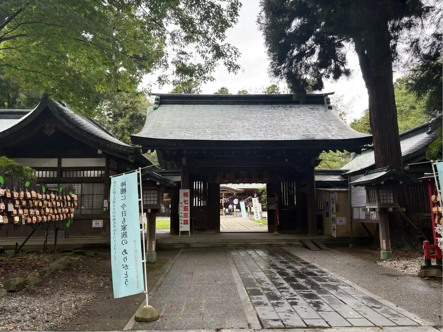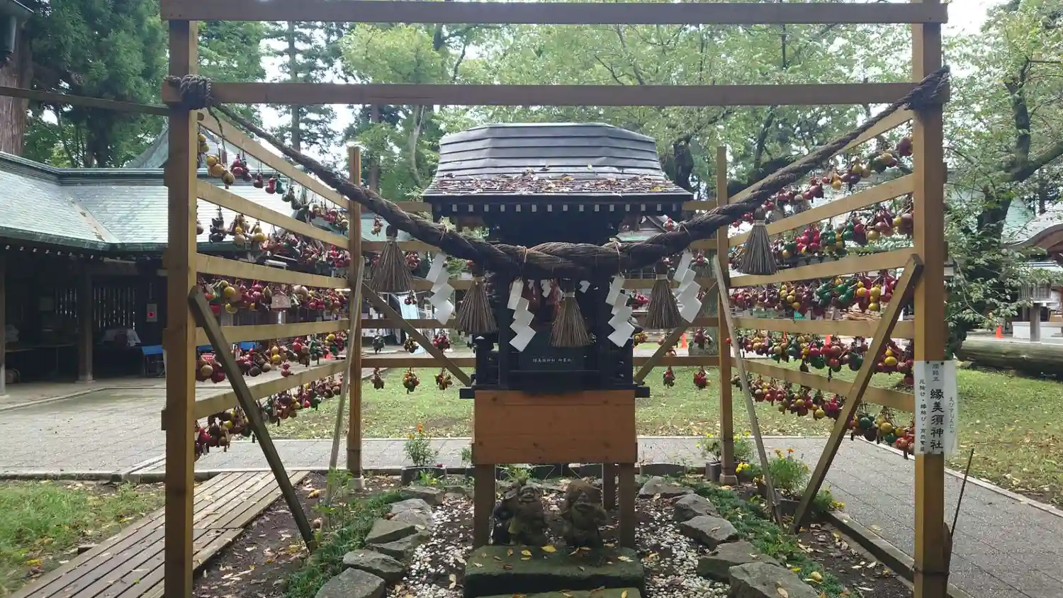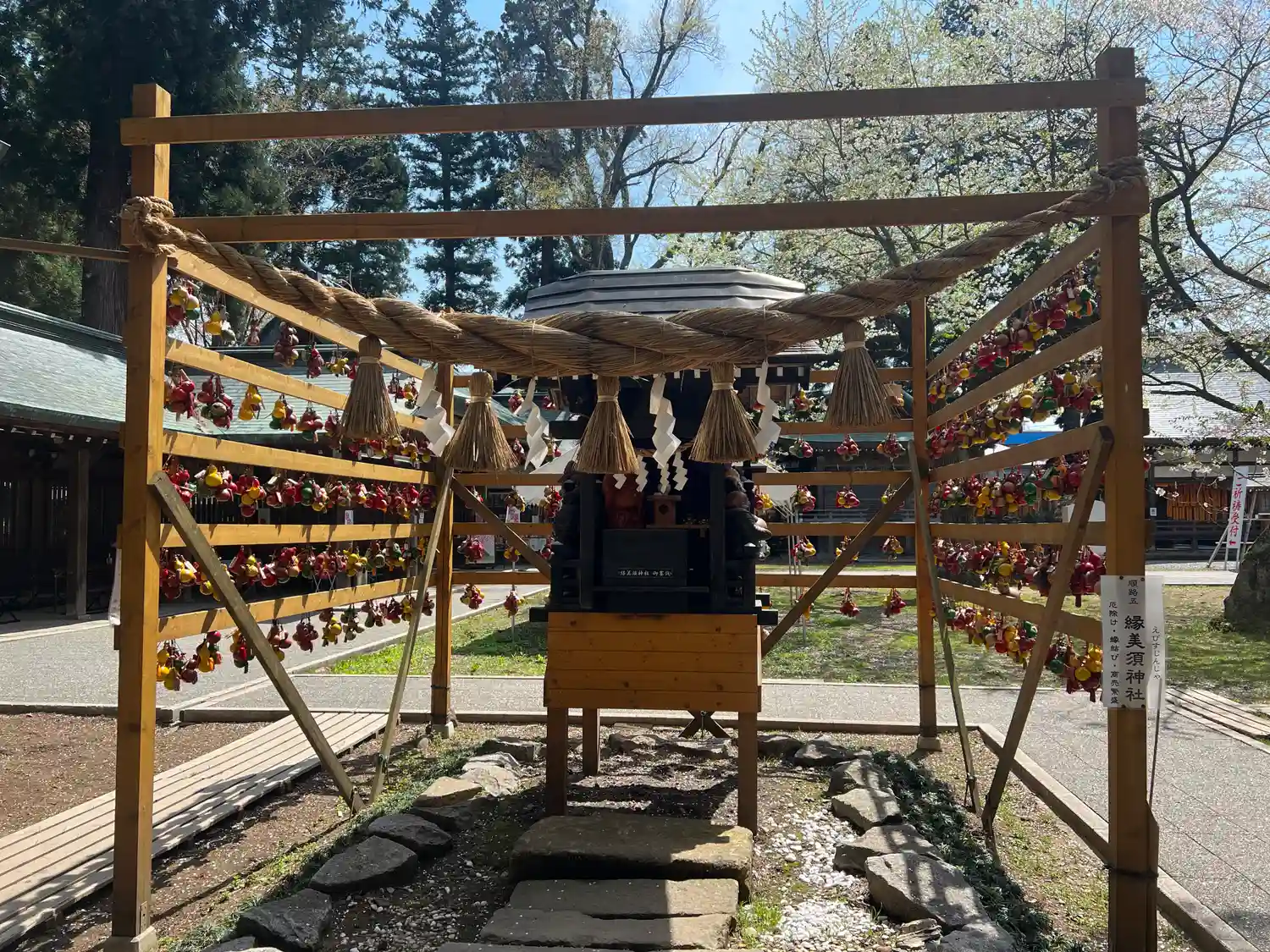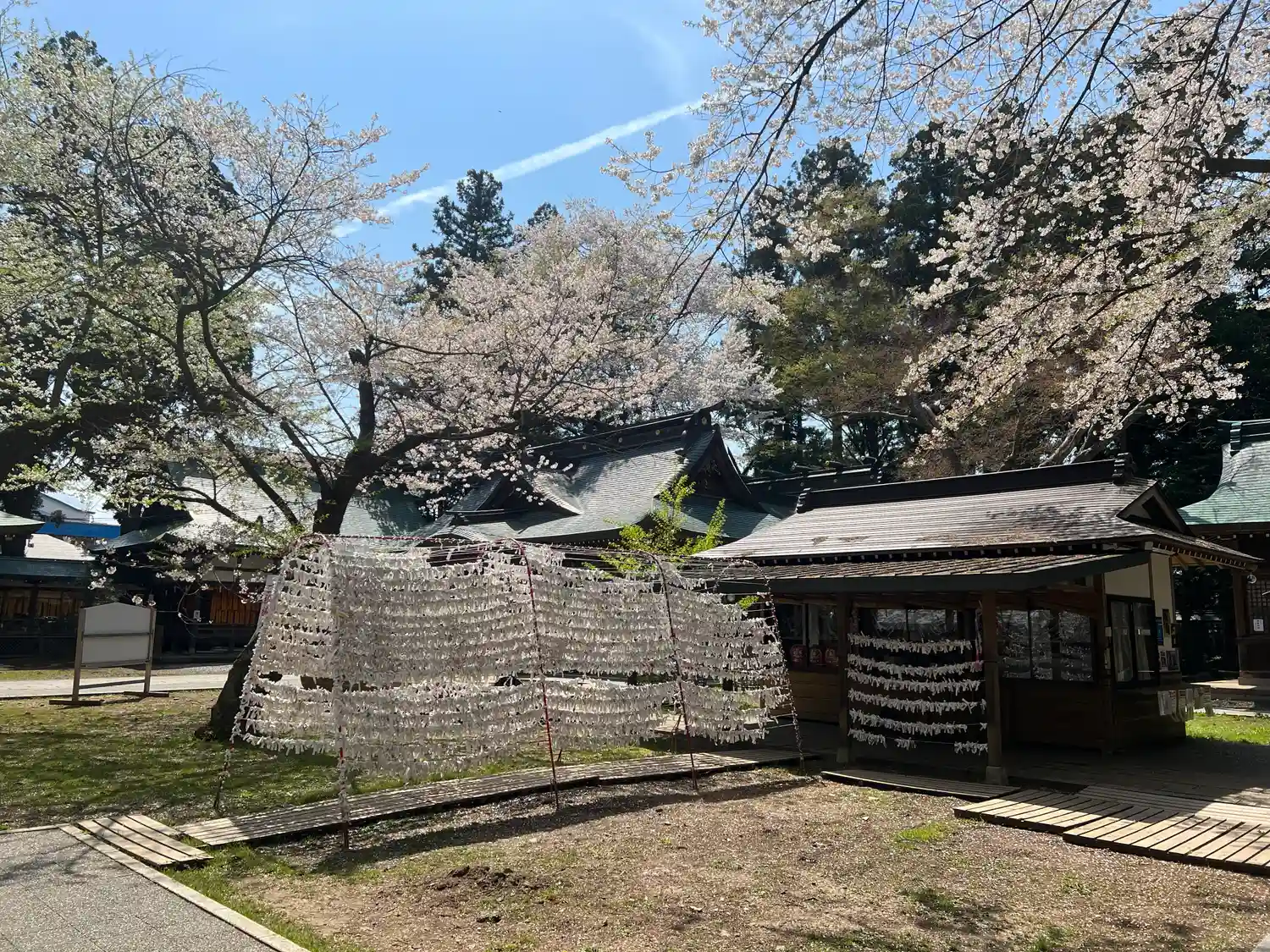 水沢招魂社の右前にある臨時授与所と御御籤掛け。