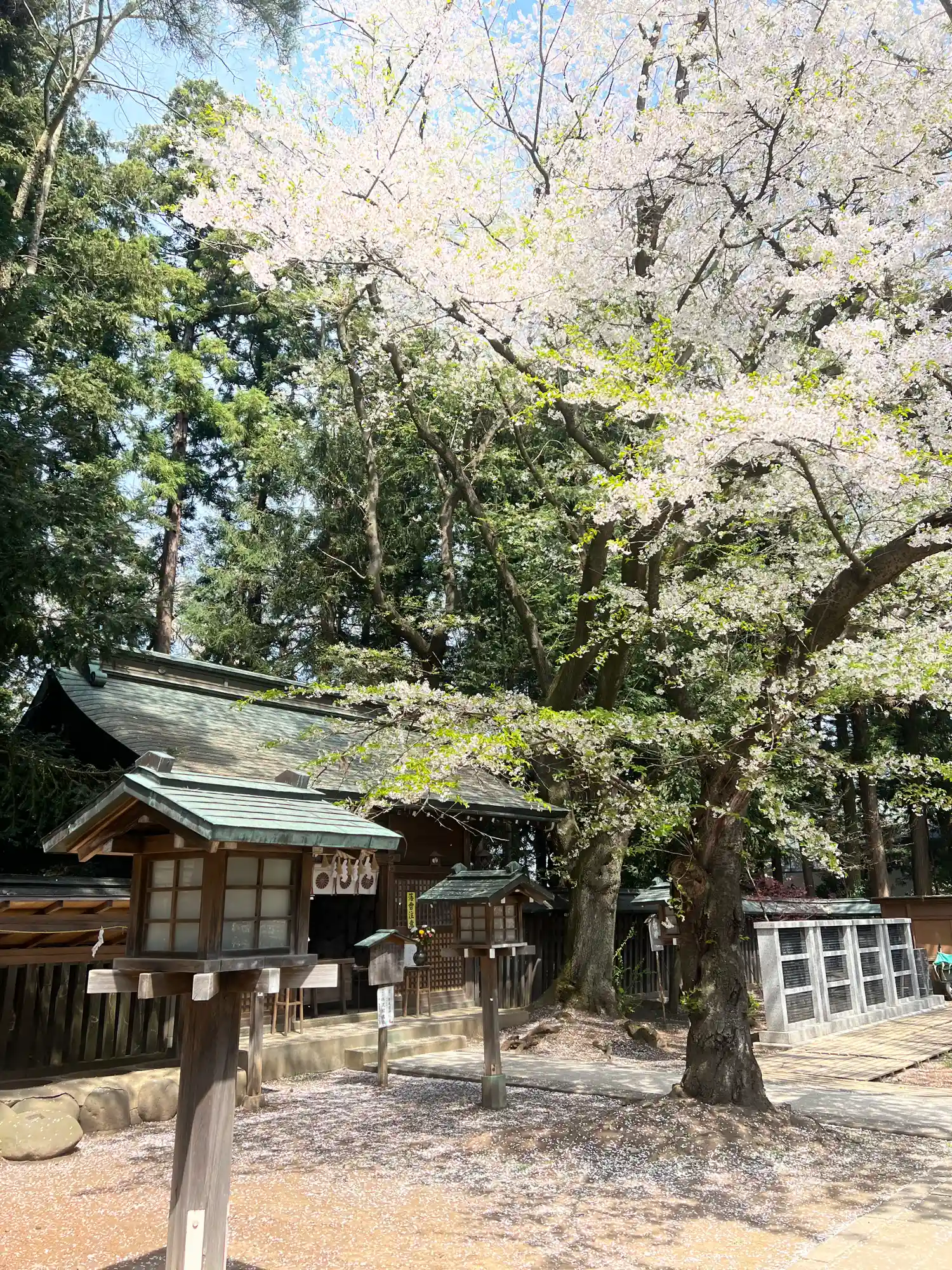 神域内の見納めに、まぶしい太陽光と満開の桜に映える<社殿>。