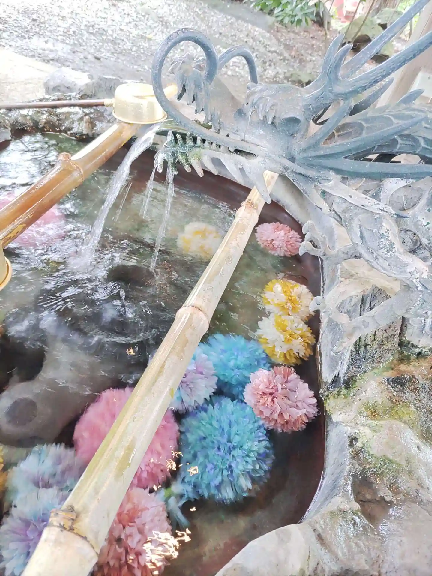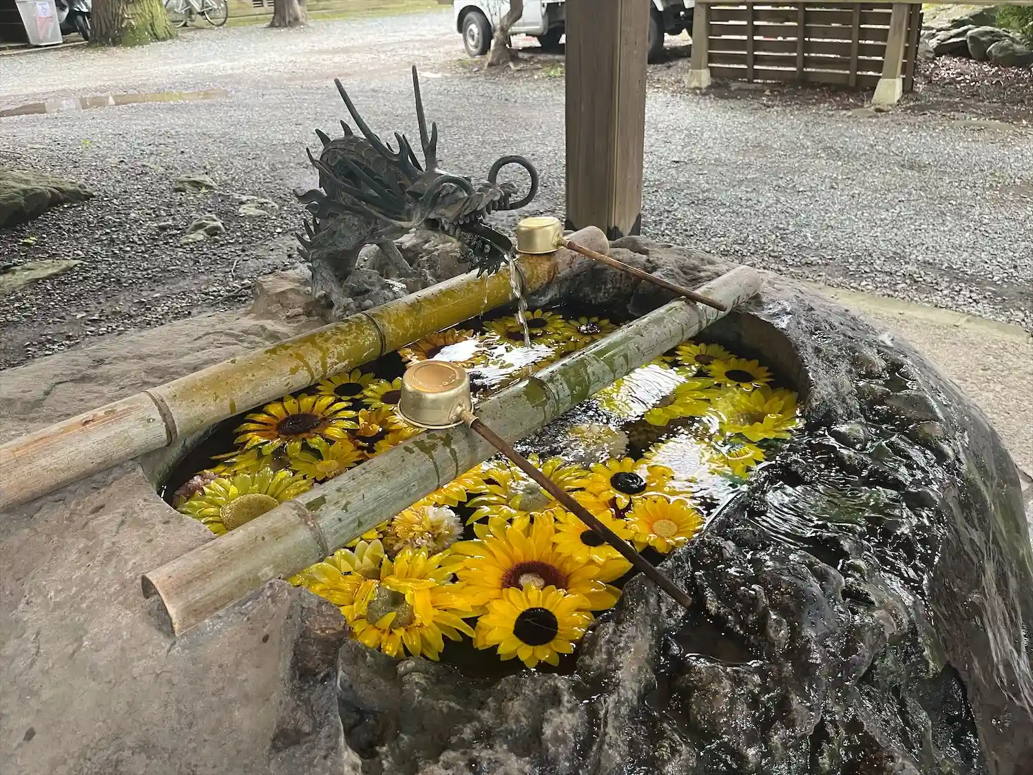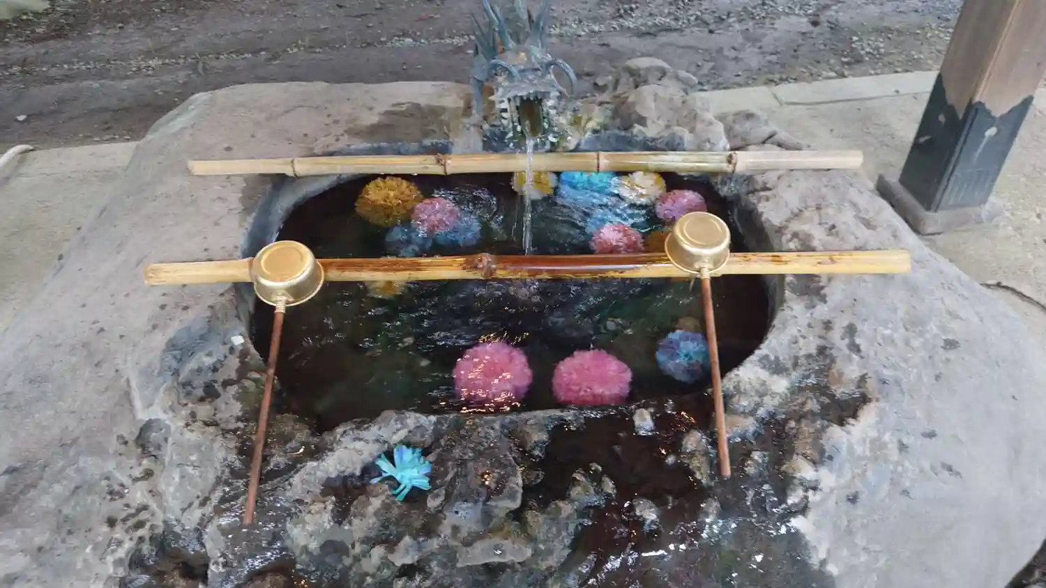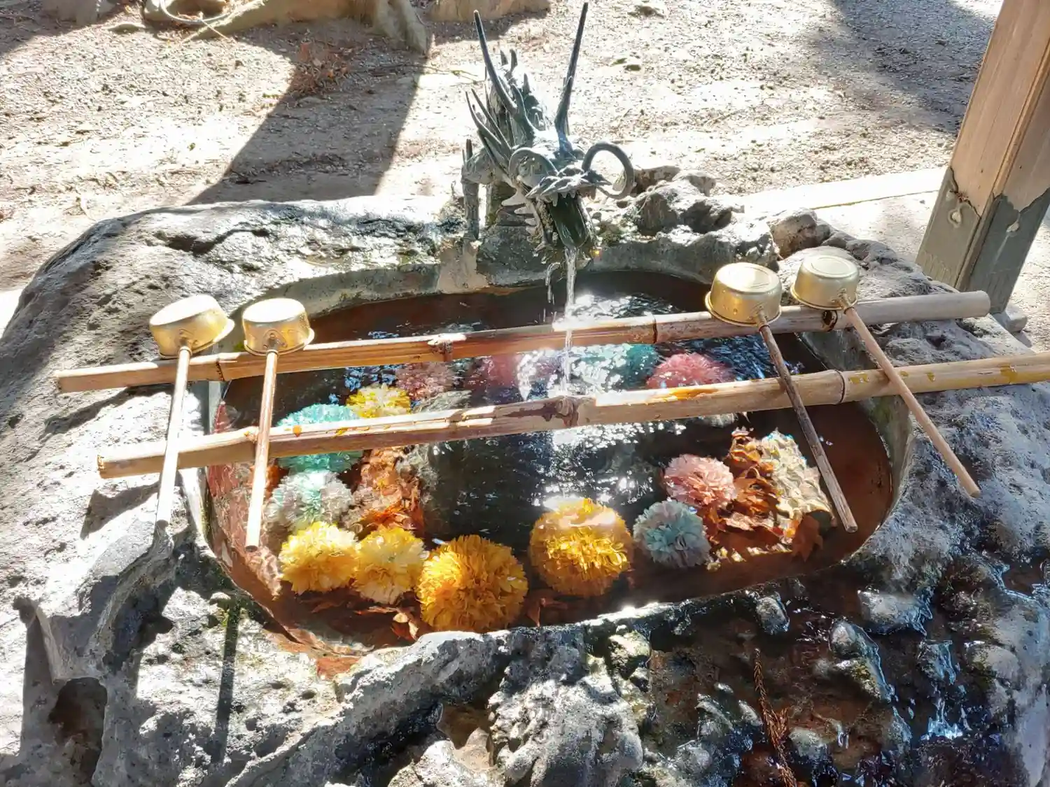 手水は丸い花が沈んでいて可愛い