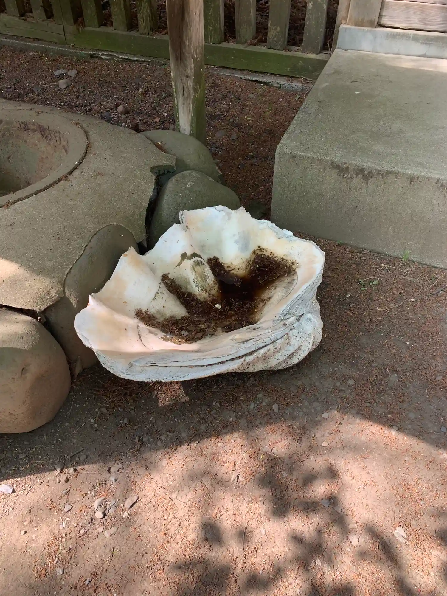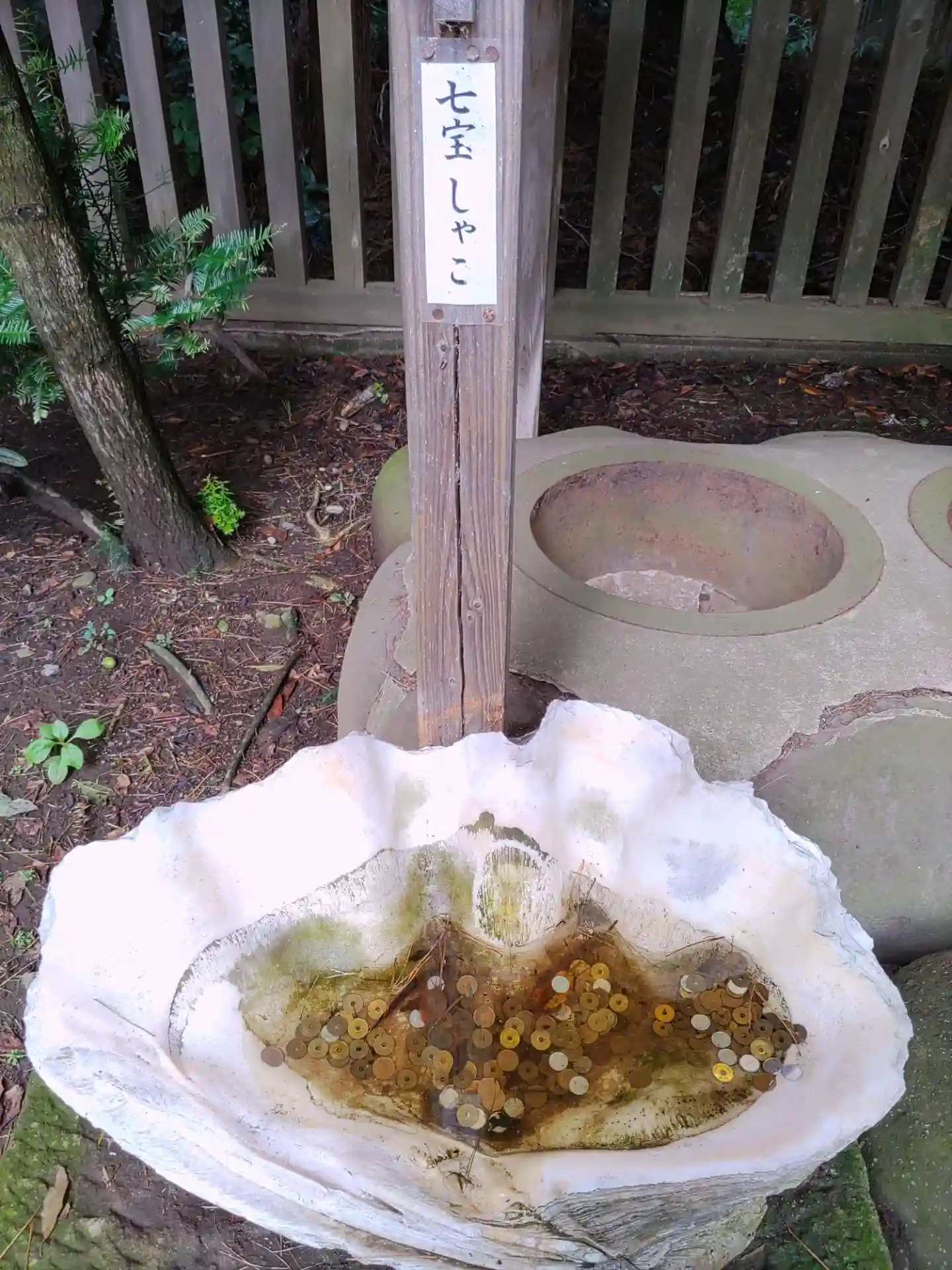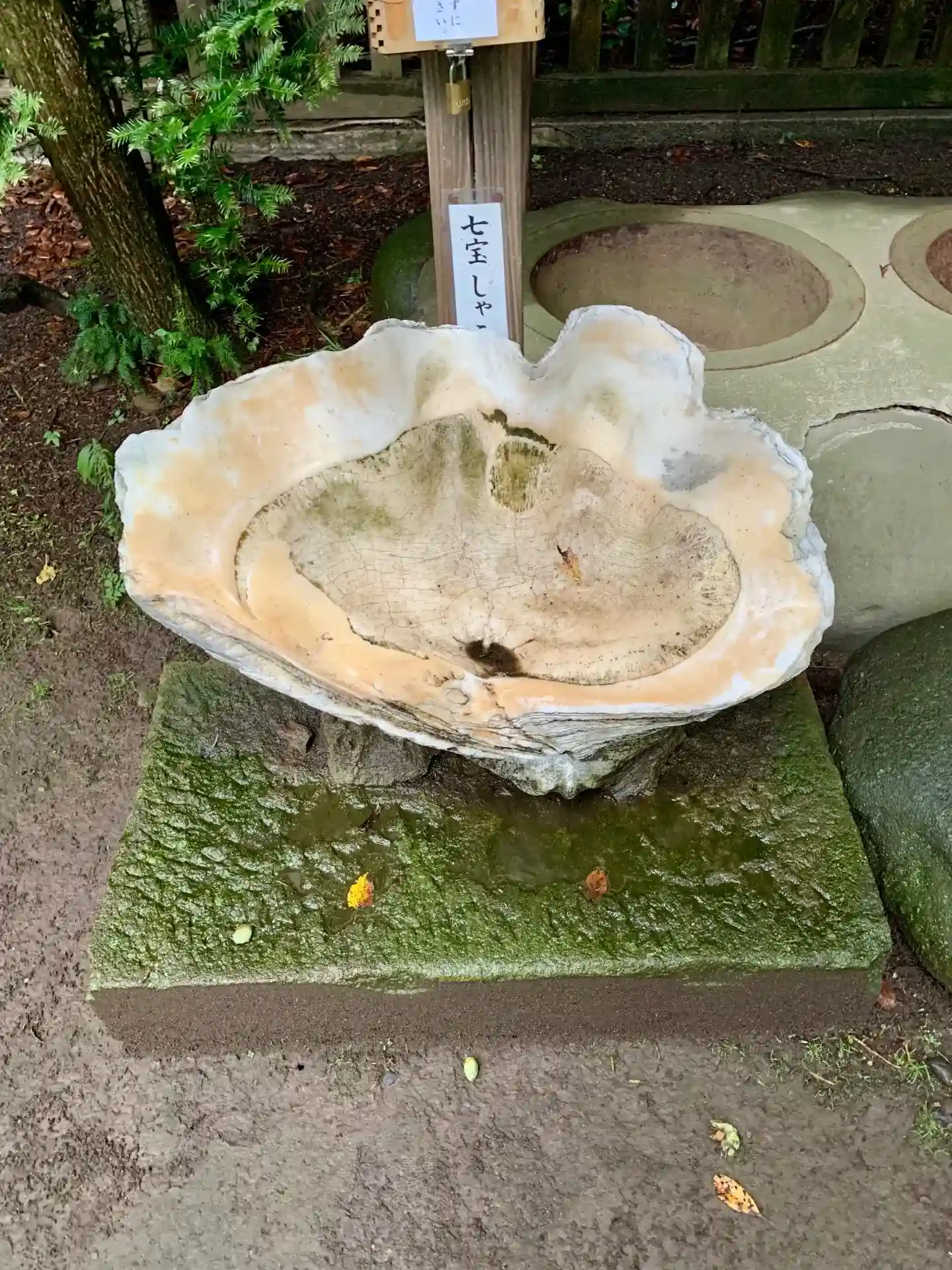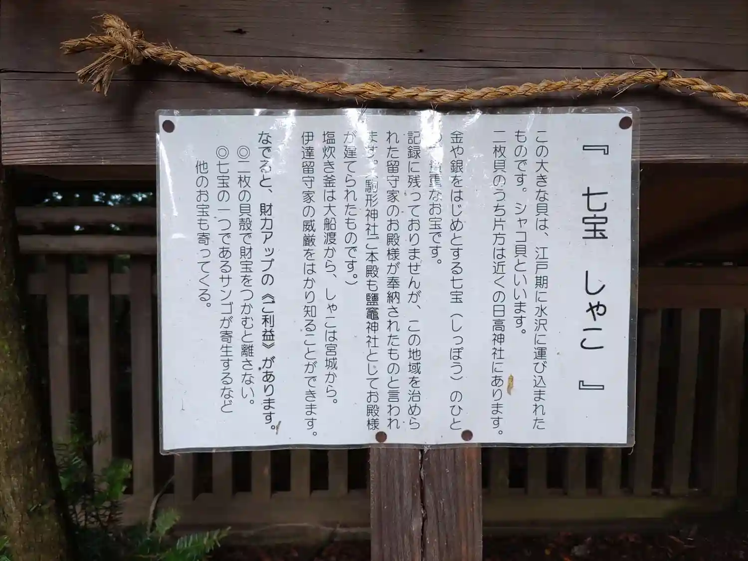 財運が開けるという<塩吹き釜>。気仙郡(現大船渡市)の豪商・稲子沢家から奉納されたものとのこと。写真左端は巨大な<七宝しゃこ>。