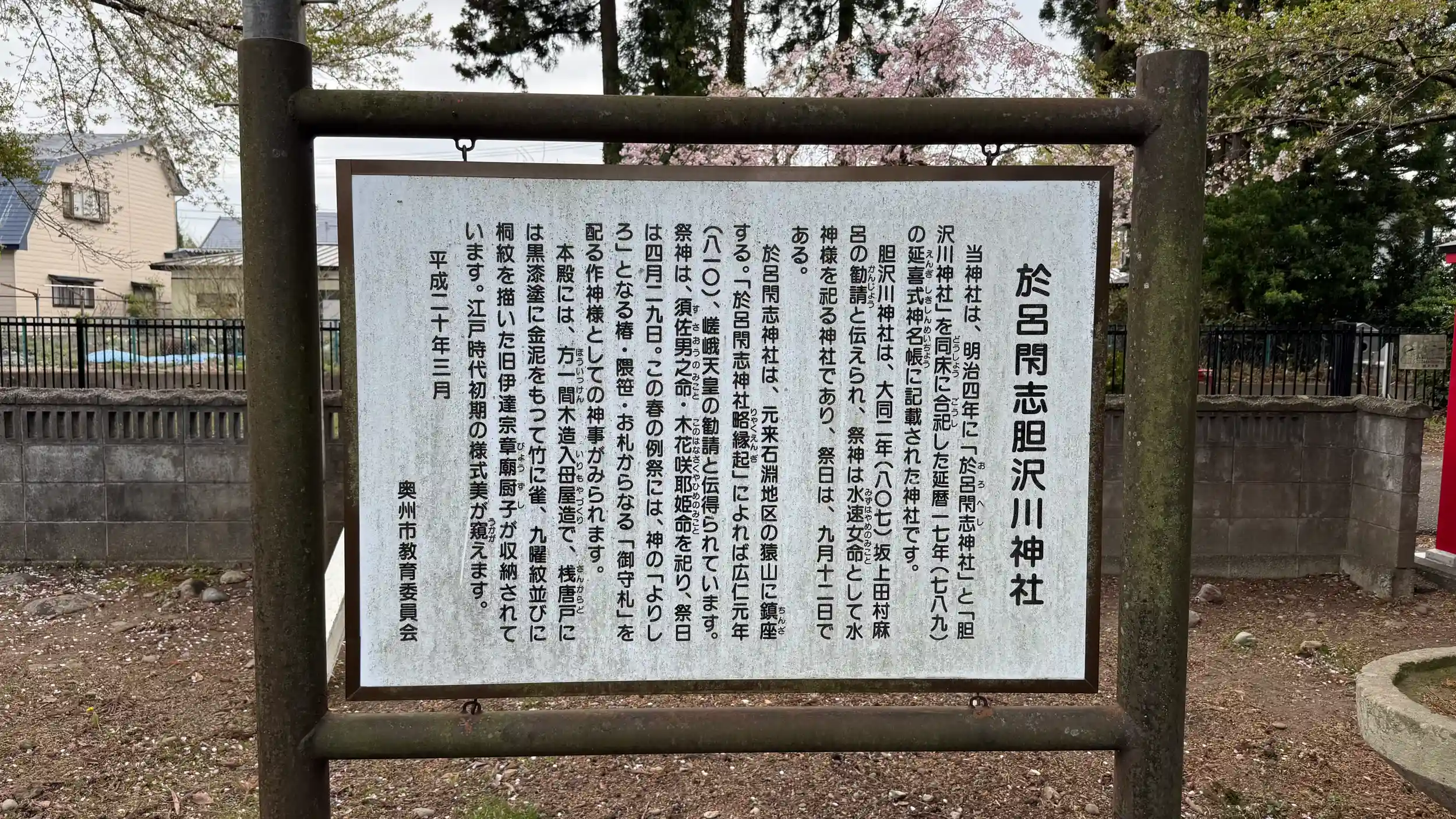当社は於呂閇志神社と胆沢川神社の合併社。胆沢川神社は、807年(大同2年)坂上田村麻呂による勧請であり、祭神は胆沢川の水速女命。於呂閇志神社は当社西方約10キロメートルにある猿岩を「作神」として祀ったもの。「於呂閇志神社縁起」によれば810年(弘仁元年)、嵯峨天皇の勧請で、祭神は木花咲耶姫命。1871年(明治4年)に合併された。