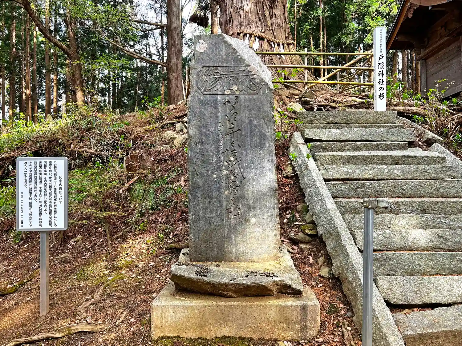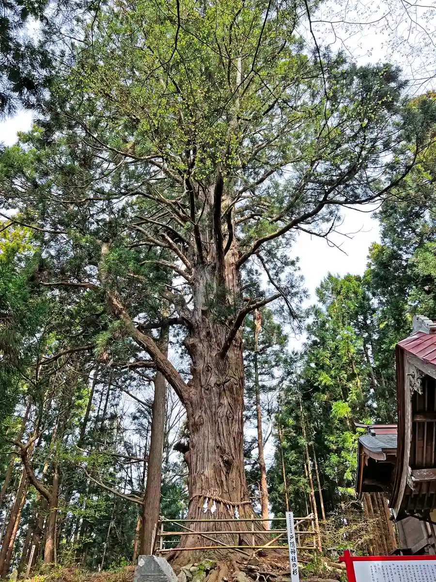 石碑の上部にある<御神木>の杉の木。伝承では樹齢700年、樹高35m、根周り7m超。