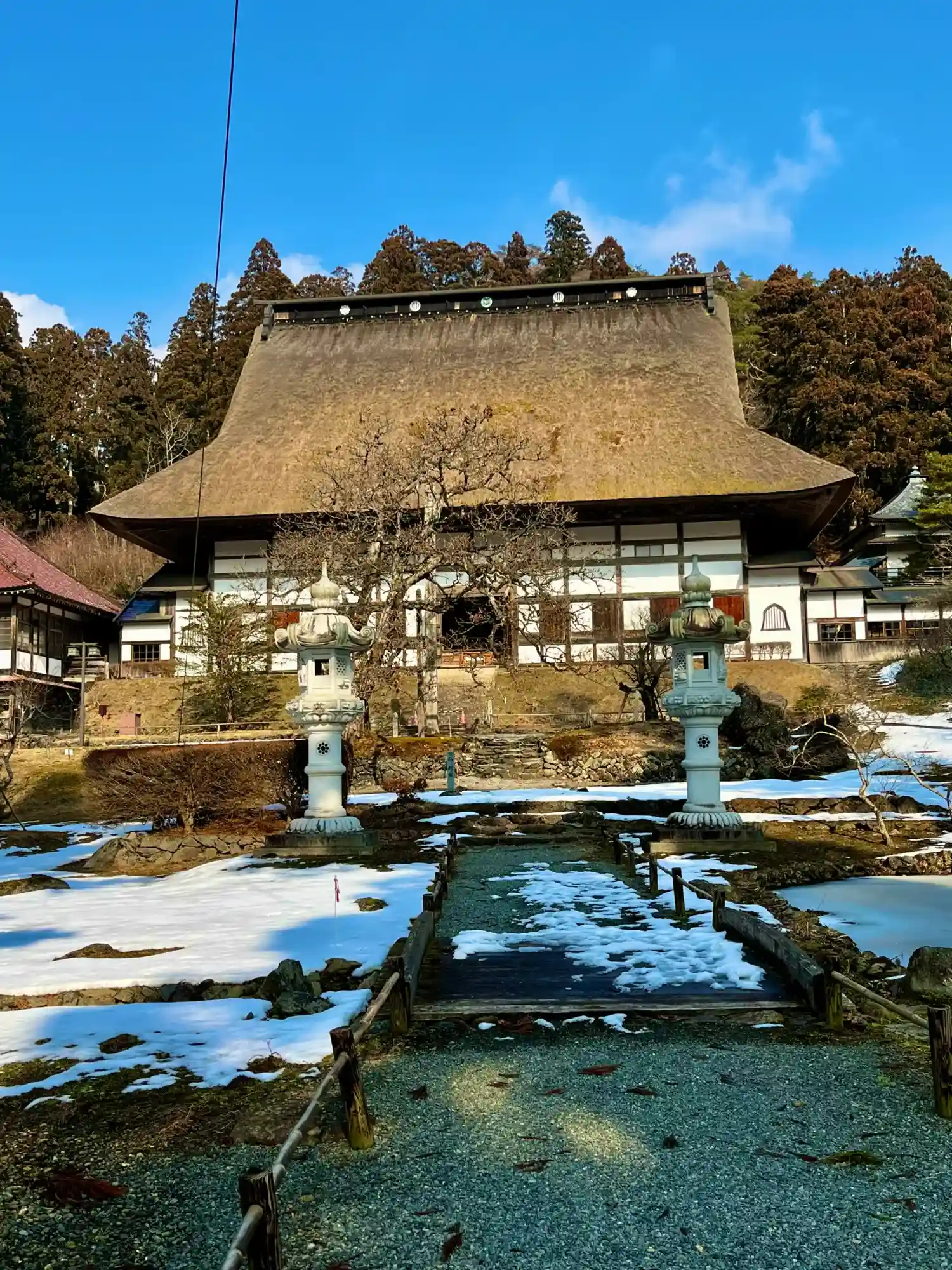 岩手県奥州市水沢に境内を構える、大梅拈華山正法寺、国指定重要文化財の施設拝観、茅葺き屋根の歴史的建造物、どの様な寺院か引用を用いて調べて見ました、色々と引用を用いて調べて見ました、山号は大梅拈華山(だいばいねんげざん)寺号、院号は正法寺、宗派は曹洞宗、ご本尊は如意輪観音、北國八十八ヵ所霊場、第八十五番札所、かつては大本山の永平寺、總持寺に次ぐ第三本山と呼ばれた。1990年(平成2年)9月11日には、本堂などが国の重要文化財に指定された。正法寺は、永平寺、總持寺と並んで東北地方における「第三の本山」の格式を得ました。その勢力は東北地方を中心に関東関西にまで広がり、東北地方の宗教、文化の形成に大きな役割を果たしてきました。末寺の数は往事、508ヵ寺とも1200ヵ寺とも記されておりました。「第三の本山」の格式は江戸初期に幕府の政策によって失われましたが、由緒ある古寺として仙臺伊達藩から寺領や建物の寄進等で別格の待遇を受けておりました。現在も73ヵ寺の末寺を有し、宗門において特別の格式を保持する古刹として広く知られている、語り継がれてきた七つの不思議な言い伝えでも有名な寺、歴史的建造物、仏閣、仏像、神社巡り、パワースポット、拝観、散策、絶景、四季の景色撮影、日本庭園、世界遺産平泉、岩手県観光、北國八十八ヵ所霊場巡り、御朱印集め等好きな方訪れて見て下さい。