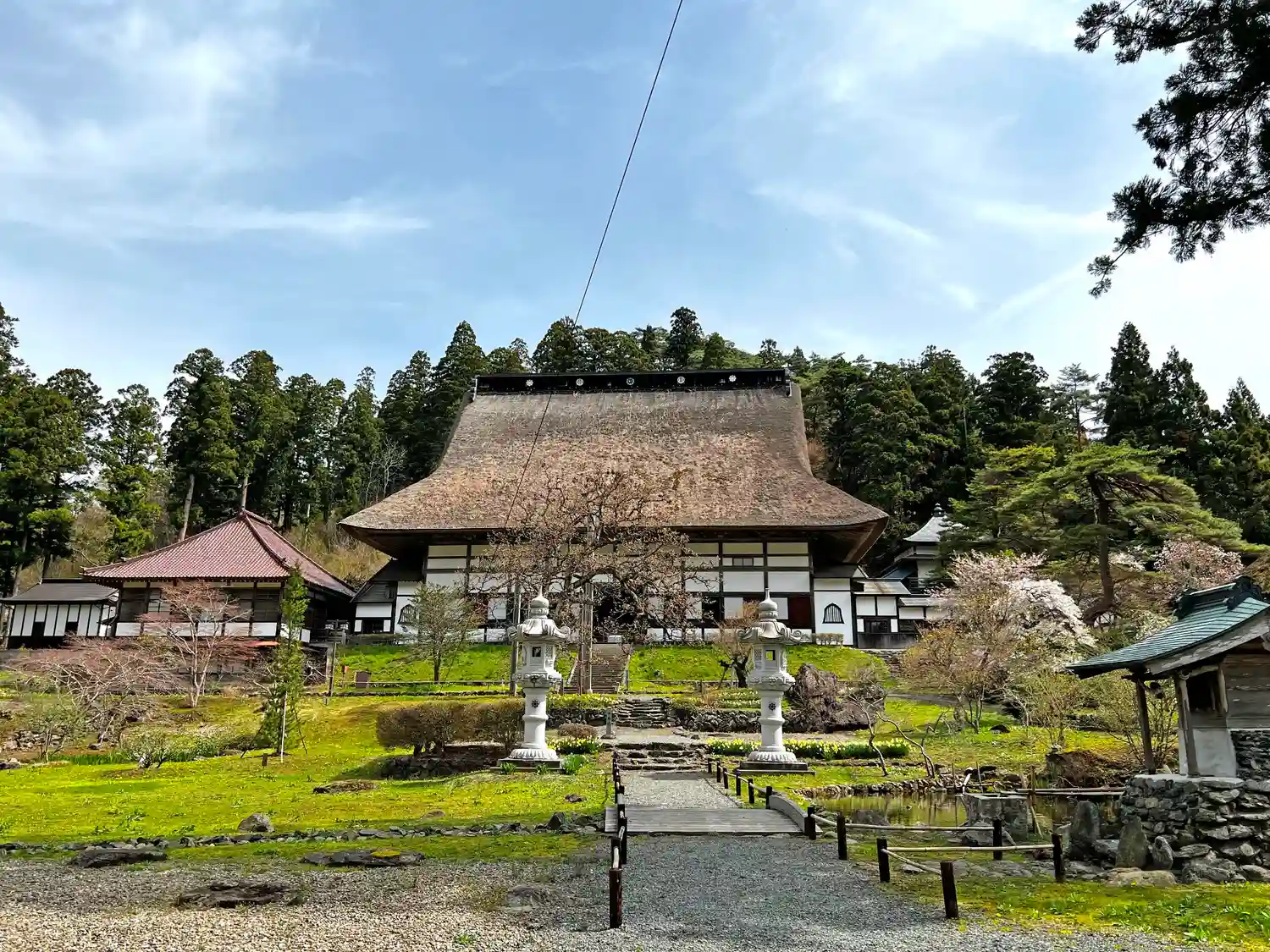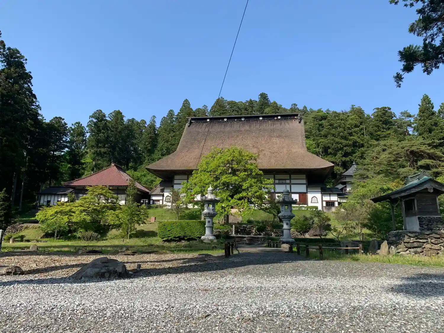 本堂は、仙台藩により江戸時代後期に再建。入母屋造、茅葺。本堂の茅葺屋根は、棟高(屋根の高さ)約26メートル、勾配49度、面積は720坪と<日本一の茅葺屋根>と言われている。